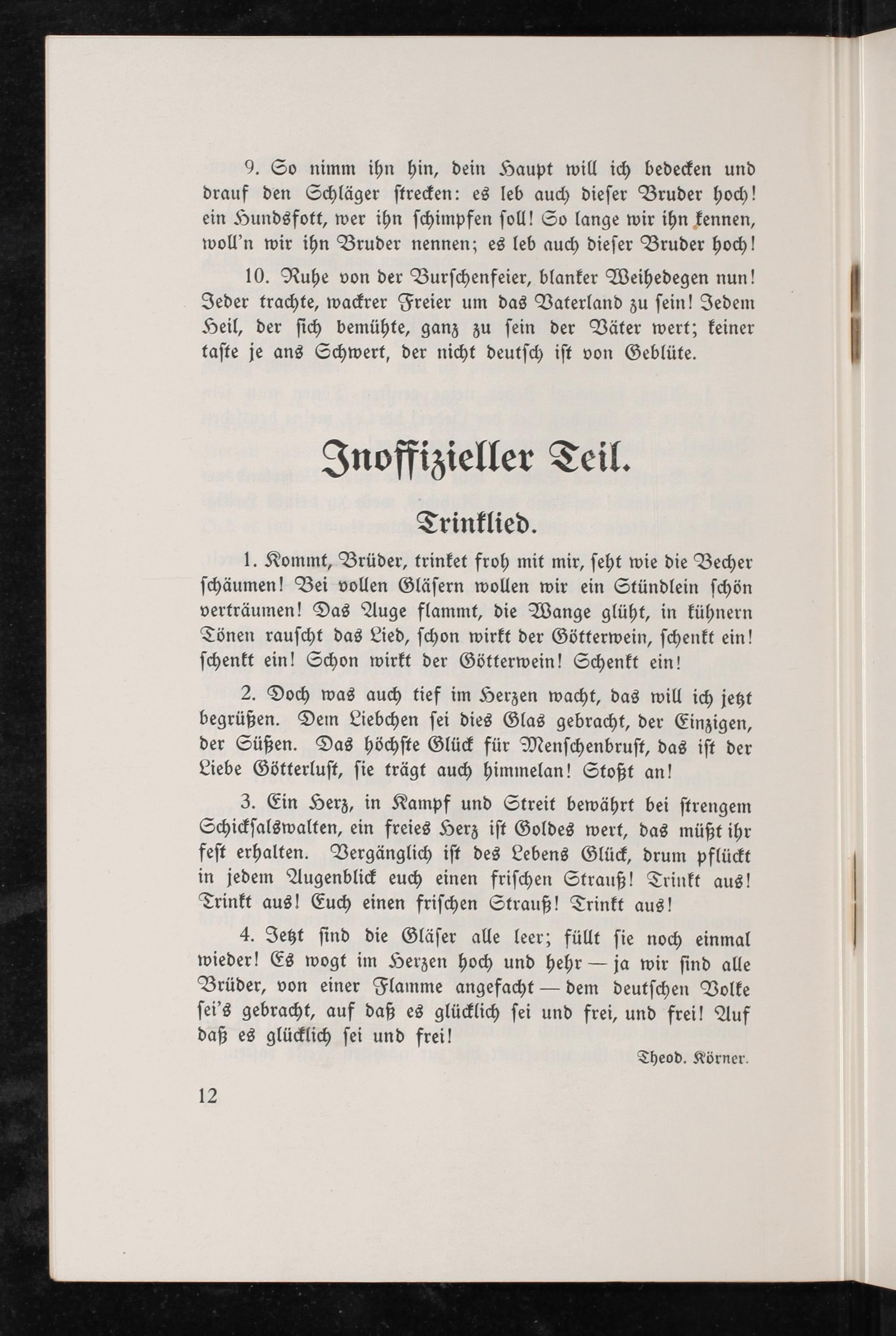 10. Ruhe von der Burſchenfeier, blanker Weihedegen nun! Jeder trachte, wackrer Freier um das Vaterland zu ſein! Jedem Heil, der ſich bemühte, ganz zu ſein der Väter wert; keiner taſte je ans Schwert, der nicht deutſch iſt von Geblüte.