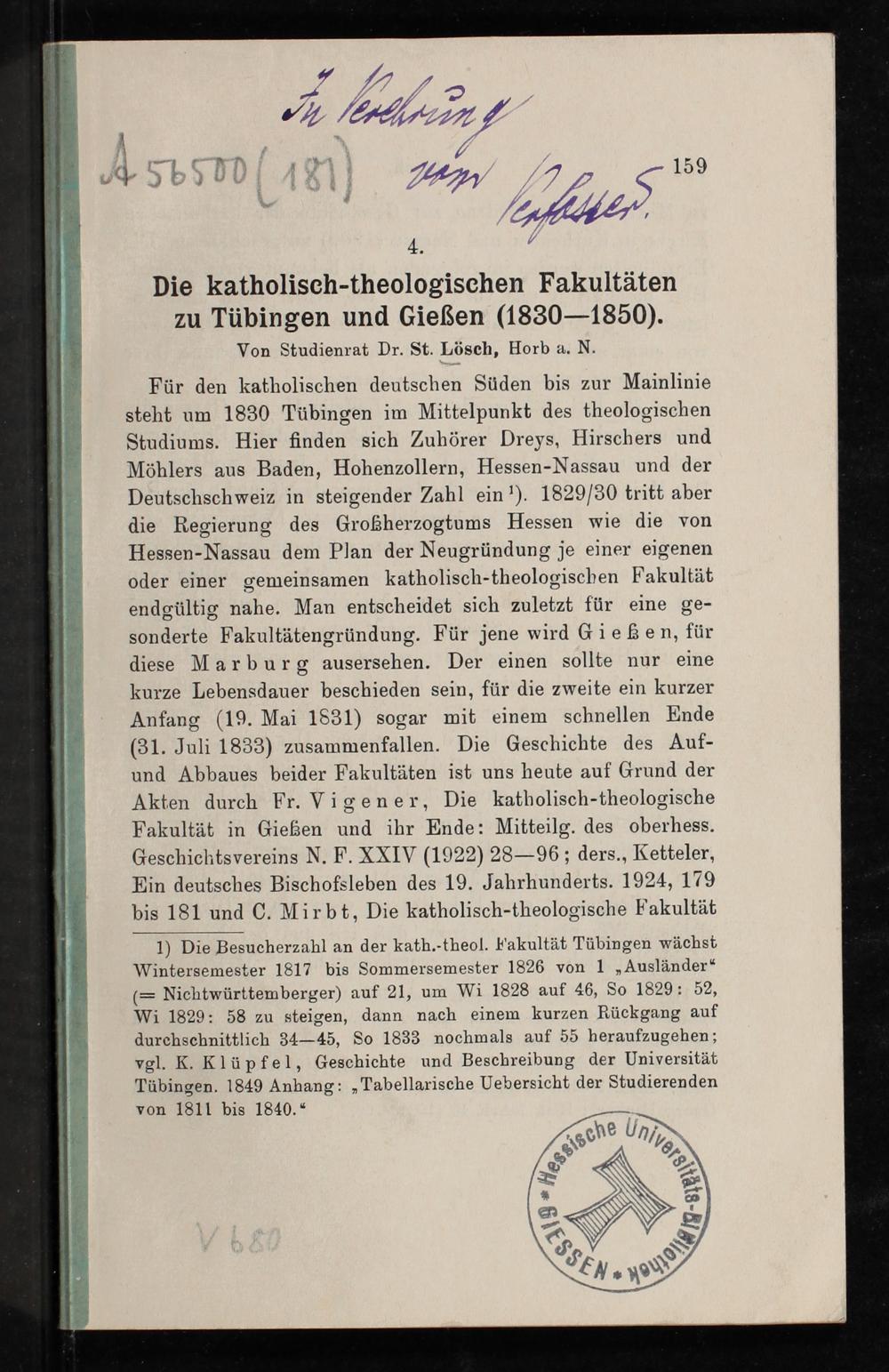 1) Die Besucherzahl an der kath.-theol. Fakultät Tübingen wächst Wintersemester 1817 bis Sommersemester 1826 von 1„Ausländer“ (= Nichtwürttemberger) auf 21, um Wi 1828 auf 46, So 1829: 52, Wi 1829: 58 zu steigen, dann nach einem kurzen Rückgang auf durchschnittlich 34— 45, So 1833 nochmals auf 55 heraufzugehen; vgl. K. Klüpfel, Geschichte und Beschreibung der Universität Tübingen. 1849 Anhang:„Tabellarische Uebersicht der Studierenden von 1811 bis 1840.“