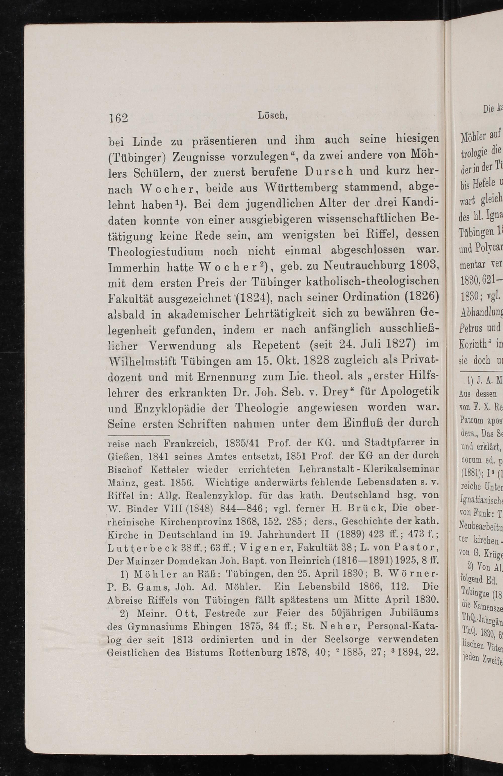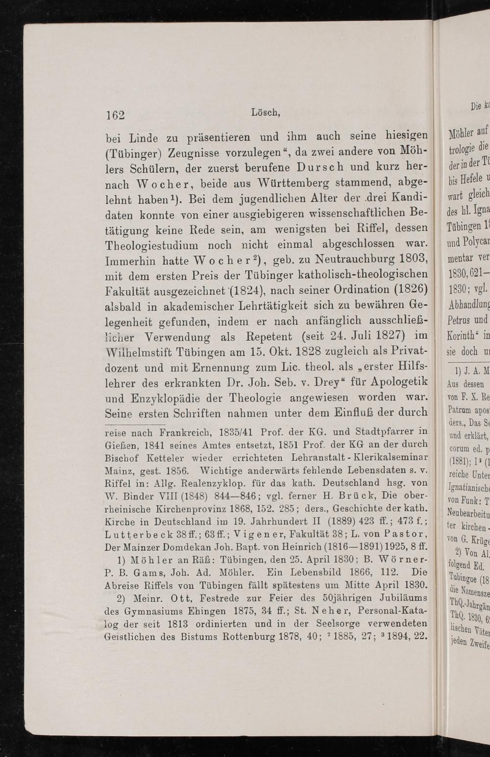 bei Linde zu präsentieren und ihm auch seine hiesigen (Tübinger) Zeugnisse vorzulegen“, da zwei andere von Möh- lers Schülern, der zuerst berufene Dursch und kurz her- nach Wocher, beide aus Württemberg stammend, abge- lehnt haben ¹). Bei dem jugendlichen Alter der drei Kandi- daten konnte von einer ausgiebigeren wissenschaftlichen Be- tätigung keine Rede sein, am wenigsten bei Riffel, dessen Theologiestudium noch nicht einmal abgeschlossen war. Immerhin hatte Wocher’), geb. zu Neutrauchburg 1803, mit dem ersten Preis der Tübinger katholisch-theologischen Fakultät ausgezeichnet(1824), nach seiner Ordination(1826) alsbald in akademischer Lehrtätigkeit sich zu bewähren Ge- legenheit gefunden, indem er nach anfänglich ausschließ- licher Verwendung als Repetent(seit 24. Juli 1827) im Wilhelmstift Tübingen am 15. Okt. 1828 zugleich als Privat- dozent und mit Ernennung zum Lic. theol. als„erster Hilfs- lehrer des erkrankten Dr. Joh. Seb. v. Drey“ für Apologetik und Enzyklopädie der Theologie angewiesen worden war. Seine ersten Schriften nahmen unter dem Einfluß der durch reise nach Frankreich, 1835/41 Prof. der KG. und Stadtpfarrer in Gießzen, 1841 seines Amtes entsetzt, 1851 Prof. der KG an der durch Bischof Ketteler wieder errichteten Lehranstalt-Klerikalseminar Mainz, gest. 1856. Wichtige anderwärts fehlende Lebensdaten s. v. Riffel in: Allg. Realenzyklop. für das kath. Deutschland hsg. von W. Binder VIII(1848) 844— 846; vgl. ferner H. Brück, Die ober- rheinische Kirchenprovinz 1868, 152. 285; ders., Geschichte der kath. Kirche in Deutschland im 19. Jahrhundert II(1889) 423 ff.; 473 f.; Lutterbeck sff.; 63 ff.; Vigener, Fakultät 38; L. von Pastor, Der Mainzer Domdekan Joh. Bapt. von Heinrich(1816—1891) 1925, 8 ff.