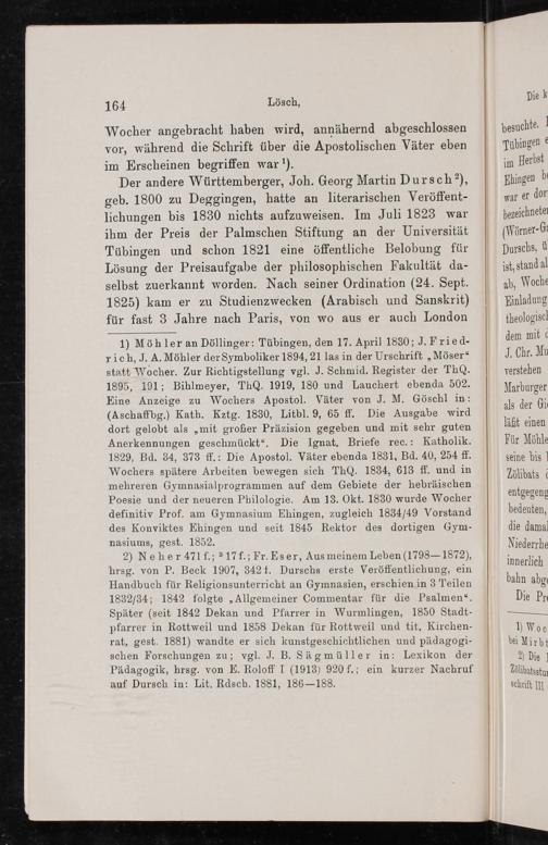 1) Möhler an Döllinger: Tübingen, den 17. April 1830; J. Fried- rich, J. A. Möhler der Symboliker 1894, 21 las in der Urschrift„Möser“ statt Wocher. Zur Richtigstellung vgl. J. Schmid. Register der ThO. 1895, 191; Bihlmeyer, ThOQ. 1919, 180 und Lauchert ebenda 502. Eine Anzeige zu Wochers Apostol. Väter von J. M. Göschl in: (Aschaffbg.) Kath. Kztg. 1830, Litbl. 9, 65 ff. Die Ausgabe wird dort gelobt als„mit großer Präzision gegeben und mit sehr guten Anerkennungen geschmückt“., Die Ignat. Briefe rec.: Katholik. 1829, Bd. 34, 373 ff.: Die Apostol. Väter ebenda 1831, Bd. 40, 254 ff. Wochers spätere Arbeiten bewegen sich ThO. 1834, 613 ff. und in mehreren Gymnasialprogrammen auf dem Gebiete der hebräischen Poesie und der neueren Philologie. Am 13. Okt. 1830 wurde Wocher definitiv Prof. am Gymnasium Ehingen, zugleich 1834/49 Vorstand des Konviktes Ehingen und seit 1845 Rektor des dortigen Gym- nasiums, gest. 1852.