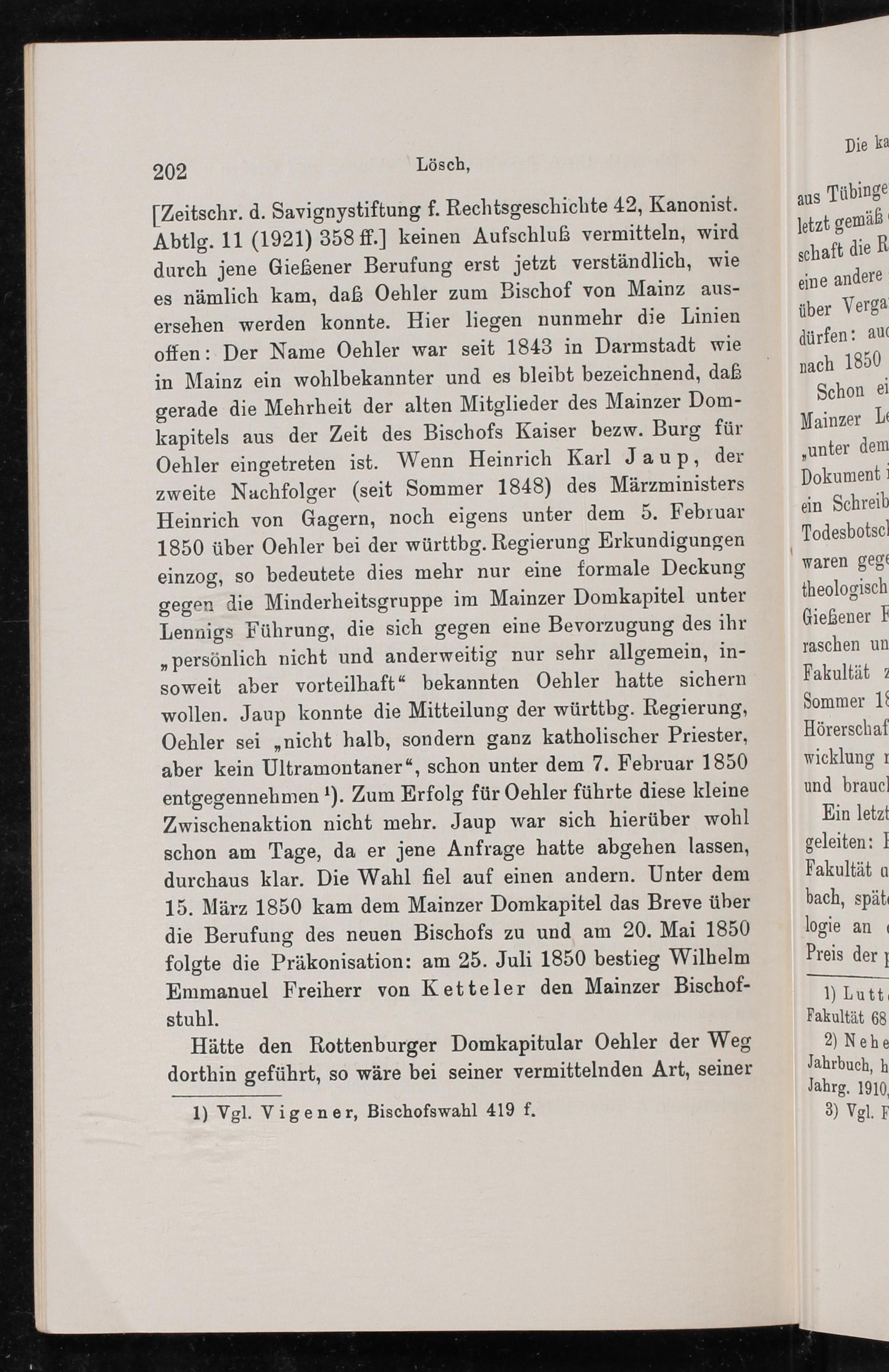 [Zeitschr. d. Savignystiftung f. Rechtsgeschichte 42, Kanonist. Abtlg. 11(1921) 358 ff.] keinen Aufschluß vermitteln, wird durch jene Gießener Berufung erst jetzt verständlich, wie es nämlich kam, daß Oehler zum Bischof von Mainz aus- ersehen werden konnte. Hier liegen nunmehr die Linien offen: Der Name Oehler war seit 1843 in Darmstadt wie in Mainz ein wohlbekannter und es bleibt bezeichnend, daß gerade die Mehrheit der alten Mitglieder des Mainzer Dom- kapitels aus der Zeit des Bischofs Kaiser bezw. Burg für Oehler eingetreten ist. Wenn Heinrich Karl Jaup, der zweite Nachfolger(seit Sommer 1848) des Märzministers Heinrich von Gagern, noch eigens unter dem 5. Februar 1850 über Oehler bei der württbg. Regierung Erkundigungen einzog, so bedeutete dies mehr nur eine formale Deckung gegen die Minderheitsgruppe im Mainzer Domkapitel unter Lennigs Führung, die sich gegen eine Bevorzugung des ihr „persönlich nicht und anderweitig nur sehr allgemein, in- soweit aber vorteilhaft“ bekannten Oehler hatte sichern wollen. Jaup konnte die Mitteilung der württbg. Regierung, Oehler sei„nicht halb, sondern ganz katholischer Priester, aber kein Ultramontaner“, schon unter dem 7. Februar 1850 entgegennehmen ¹). Zum Erfolg für Oehler führte diese kleine Zwischenaktion nicht mehr. Jaup war sich hierüber wohl schon am Tage, da er jene Anfrage hatte abgehen lassen, durchaus klar. Die Wahl fiel auf einen andern. Unter dem 15. März 1850 kam dem Mainzer Domkapitel das Breve über die Berufung des neuen Bischofs zu und am 20. Mai 1850 folgte die Präkonisation: am 25. Juli 1850 bestieg Wilhelm Emmanuel Freiherr von Ketteler den Mainzer Bischof- stuhl.
