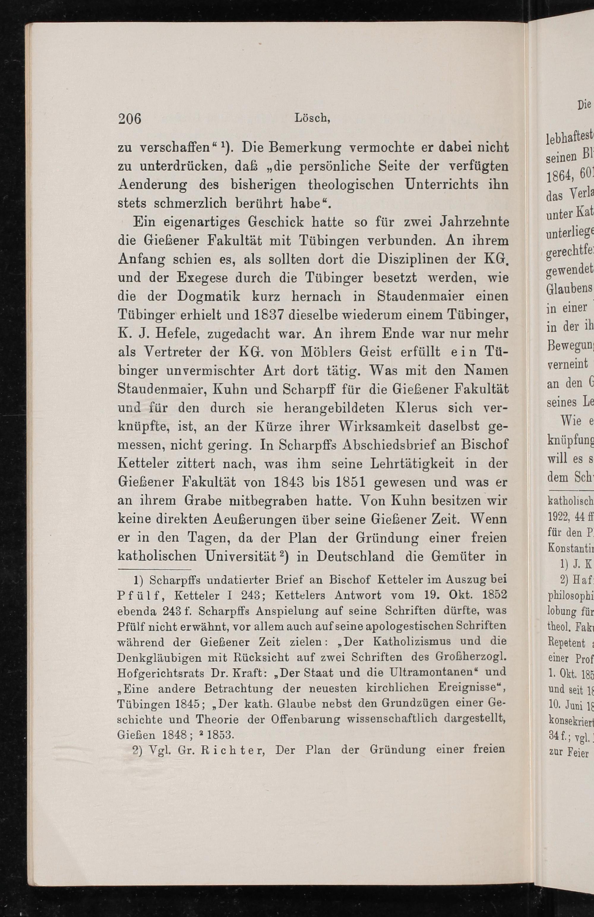 Ein eigenartiges Geschick hatte so für zwei Jahrzehnte die Gießener Fakultät mit Tübingen verbunden. An ihrem Anfang schien es, als sollten dort die Disziplinen der KG. und der Exegese durch die Tübinger besetzt werden, wie die der Dogmatik kurz hernach in Staudenmaier einen Tübinger erhielt und 1837 dieselbe wiederum einem Tübinger, K. J. Hefele, zugedacht war. An ihrem Ende war nur mehr als Vertreter der KG. von Möblers Geist erfüllt ein Tü- binger unvermischter Art dort tätig. Was mit den Namen Staudenmaier, Kuhn und Scharpff für die Gießener Fakultät und für den durch sie herangebildeten Klerus sich ver- knüpfte, ist, an der Kürze ihrer Wirksamkeit daselbst ge- messen, nicht gering. In Scharpffs Abschiedsbrief an Bischof Ketteler zittert nach, was ihm seine Lehrtätigkeit in der Gießener Fakultät von 1843 bis 1851 gewesen und was er an ihrem Grabe mitbegraben hatte. Von Kuhn besitzen wir keine direkten Aeußerungen über seine Gießener Zeit. Wenn er in den Tagen, da der Plan der Gründung einer freien katholischen Universität ²) in Deutschland die Gemüter in