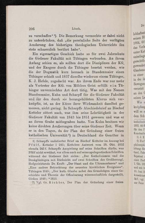 1) Scharpffs undatierter Brief an Bischof Ketteler im Auszug bei Pfülf, Ketteler I 243; Kettelers Antwort vom 19. Okt. 1852 ebenda 243 f. Scharpffs Anspielung auf seine Schriften dürfte, was Pfülf nicht erwähnt, vor allem auch aufseine apologestischen Schriften während der Gießener Zeit zielen:„Der Katholizismus und die Denkgläubigen mit Rücksicht auf zwei Schriften des Großherzogl. Hofgerichtsrats Dr. Kraft:„Der Staat und die Ultramontanen“ und „Eine andere Betrachtung der neuesten kirchlichen Ereignisse“, Tübingen 1845;„Der kath. Glaube nebst den Grundzügen einer Ge- schichte und Theorie der Offenbarung wissenschaftlich dargestellt,