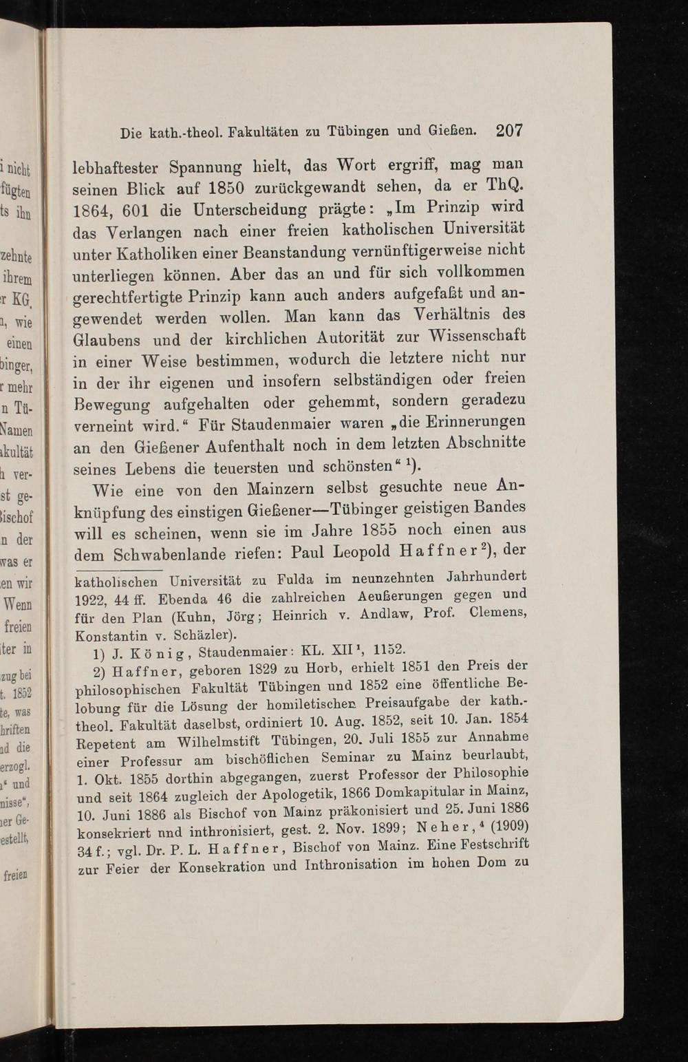 fügten seinen Blick auf 1850 zurückgewandt sehen, da er ThO. ts ibn 1864, 601 die Unterscheidung prägte:„Im Prinzip wird das Verlangen nach einer freien katholischen Universität zehnte unter Katholiken einer Beanstandung vernünftigerweise nicht ihrem unterliegen können. Aber das an und für sich vollkommen r KG. gerechtfertigte Prinzip kann auch anders aufgefaßt und an- 4, wie gewendet werden wollen. Man kann das Verhältnis des einen Glaubens und der kirchlichen Autorität zur Wissenschaft binger, in einer Weise bestimmen, wodurch die letztere nicht nur rmehr in der ihr eigenen und insofern selbständigen oder freien n Tü- Bewegung aufgehalten oder gehemmt, sondern geradezu Jamen verneint wird.“ Für Staudenmaier waren„die Erinnerungen kkultät an den Gießener Aufenthalt noch in dem letzten Abschnitte u ver- seines Lebens die teuersten und schönsten“ ¹). st ge— Wie eine von den Mainzern selbst gesuchte neue An- ischof knüpfung des einstigen Gießener— Tübinger geistigen Bandes u der will es scheinen, wenn sie im Jahre 1855 noch einen aus Nas er dem Schwabenlande riefen: Paul Leopold Haffner“), der en wir katholischen Universität zu Fulda im neunzehnten Jahrhundert Wenn 1922, 44 ff. Ebenda 46 die zahlreichen Aeußerungen gegen und freier für den Plan(Kuhn, Jörg; Heinrich v. Andlaw, Prof. Clemens, . Konstantin v. Schäzler). ter in 1) J. König, Staudenmaier: KL. XII', 1152. zug bei 2) Haffner, geboren 1829 zu Horb, erhielt 1851 den Preis der t. 1852 philosophischen Fakultät Tübingen und 1852 eine öffentliche Be- te, was lobung für die Lösung der homiletischen Preisaufgabe der kath.- briften theol. Fakultät daselbst, ordiniert 10. Aug. 1852, seit 10. Jan. 1854 ad die Repetent am Wilhelmstift Tübingen, 20. Juli 1855 zur Annahme erzogl. einer Professur am bischöflichen Seminar zu Mainz beurlaubt, 1¹ und 1. Okt. 1855 dorthin abgegangen, zuerst Professor der Philosophie nisse“, und seit 1864 zugleich der Apologetik, 1866 Domkapitular in Mainz,