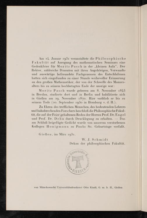 Zu Ehren des trefflichen Menschen, des bedeutenden Lehrers und bahnbrechenden Forschers beschloß die Philosophische Fakul- tät, die auf der Feier gehaltenen Reden der Herren Prof. Dr. Engel und Prof. Dr. Dehn durch Drucklegung zu erhalten.— Das am Schluß beigefügte Gedicht wurde von unserem verstorbenen Kollegen Honigmann zu Paschs 80. Geburtstage verfaßt.