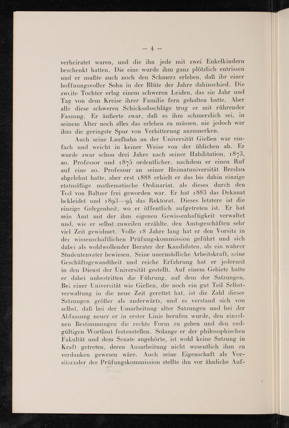 Auch seine Laufbahn an der Universität Gießen war ein- fach und weicht in keiner Weise von der üblichen ab. Er wurde zwar schon drei Jahre nach seiner Habilitation, 1873, ao. Professor und 1875 ordentlicher, nachdem er einen Ruf auf eine ao. Professur an seiner Heimatuniversität Breslau abgelehnt hatte, aber erst 1888 erhielt er das bis dahin einzige etatmäßige mathematische Ordinariat, als dieses durch den Tod von Baltzer frei geworden war. Er hat 1883 das Dekanat bekleidet und 1893— 94 das Rektorat. Dieses letztere ist die einzige Gelegenheit, wo er öffentlich aufgetreten ist. Er hat sein Amt mit der ihm eigenen Gewissenhaftigkeit verwaltet und, wie er selbst zuweilen erzählte, den Amtsgeschäften sehr viel Zeit gewidmet. Volle 18 Jahre lang hat er den Vorsitz in der wissenschaftlichen Prüfungskommission geführt und sich dabei als wohlwollender Berater der Kandidaten, als ein wahrer Studentenvater bewiesen. Seine unermüdliche Arbeitskraft, seine Geschäftsgewandtheit und reiche Erfahrung hat er jederzeit in den Dienst der Universität gestellt. Auf einem Gebiete hatte er dabei unbestritten die Führung, auf dem der Satzungen. Bei einer Universität wie Gießen, die noch ein gut Teil Selbst- verwaltung in die neue Zeit gerettet hat, ist die Zahl dieser Satzungen größer als anderwärts, und es verstand sich von selbst, daß bei der Umarbeitung alter Satzungen und bei der Abfassung neuer er in erster Linie berufen wurde, den einzel- nen Bestimmungen die rechte Form zu geben und den end- gültigen Wortlaut festzustellen. Solange er der philosophischen Fakultät und dem Senate angehörte, ist wohl keine Satzung in Kraft getreten, deren Ausarbeitung nicht wesentlich ihm zu verdanken gewesen wäre. Auch seine Eigenschaft als Vor- sitzender der Prüfungskommission stellte ihn vor ähnliche Auf-
