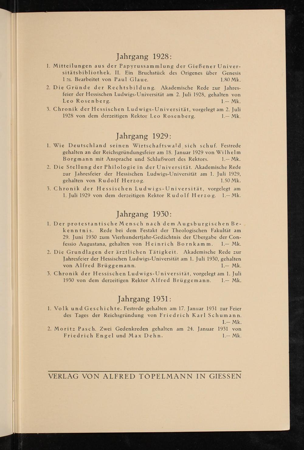 1. Mitteilungen aus der Papyrussammlung der Gießener Univer- sitätsbibliothek. II. Ein Bruchstück des Origenes über Genesis 1 28. Bearbeitet von Paul Glaue. 1.80 Mk. 2. Die Gründe der Rechtsbildung. Akademische Rede zur Jahres- feier der Hessischen Ludwigs-Universität am 2. Juli 1928, gehalten von Leo Rosenberg. 1.— Mk. 3. Chronik der Hessischen Ludwigs-Universität, vorgelegt am 2. Juli 1928 von dem derzeitigen Rektor Leo Rosenberg. 1.— Mk.