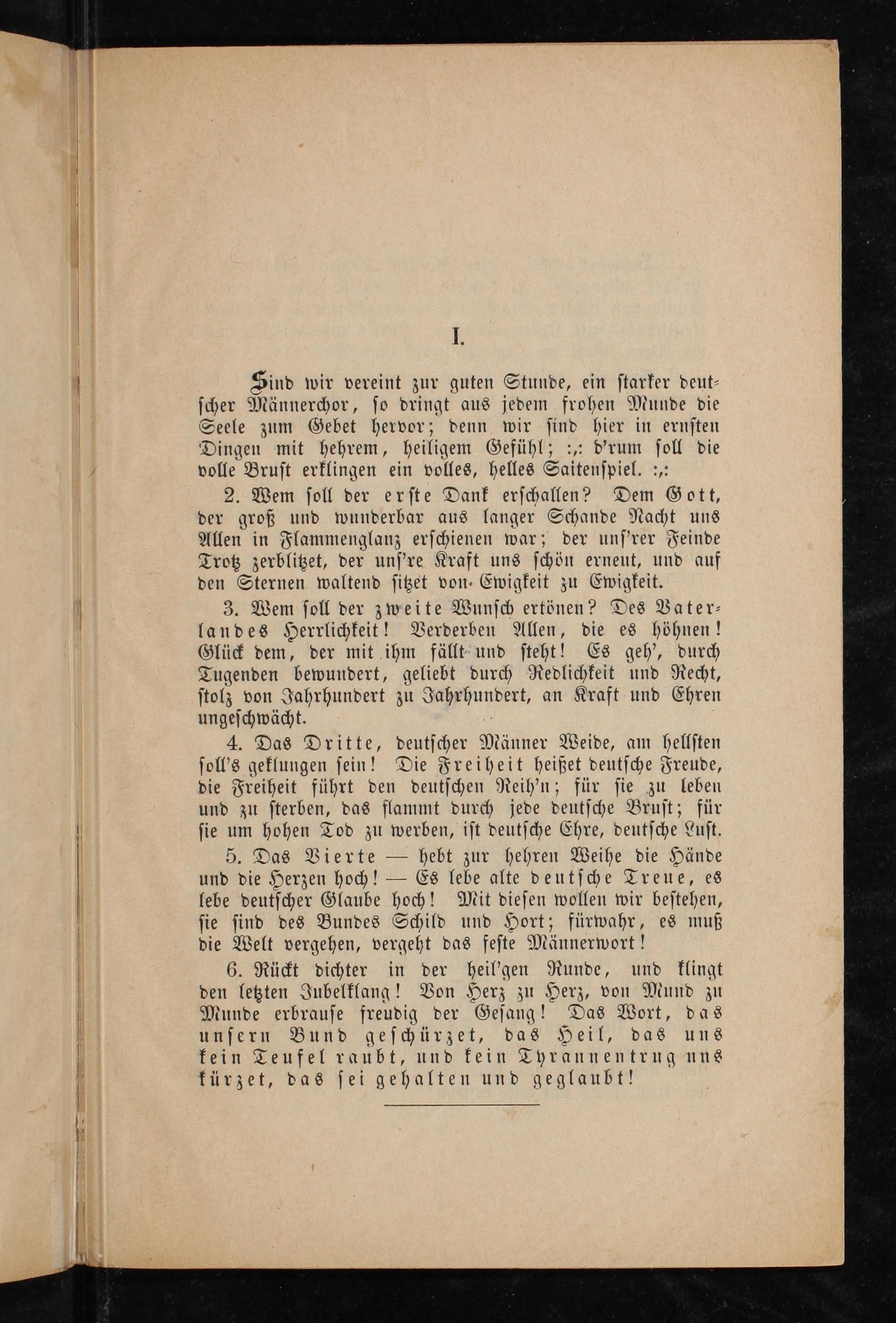 4. Das Dritte, deutſcher Männer Weide, am hellſten ſoll's geklungen ſein! Die Freiheit heißet deutſche Freude, die Freiheit führt den deutſchen Reih'n; für ſie zu leben und zu ſterben, das flammt durch jede deutſche Bruſt; für ſie um hohen Tod zu werben, iſt deutſche Ehre, deutſche Luſt.