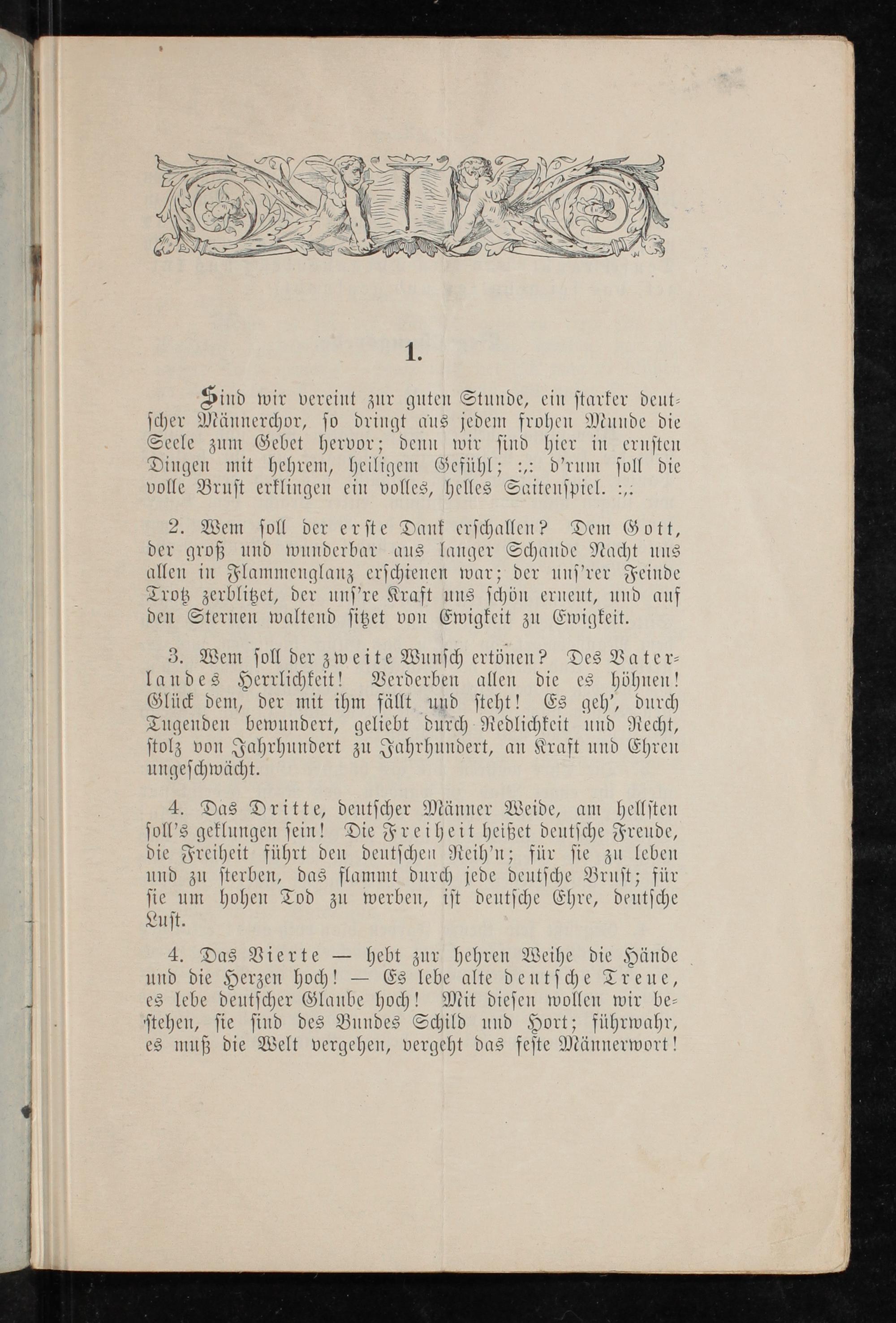 Sind wir vereint zur guten Stunde, ein ſtarker deut ſcher Männerchor, ſo dringt aus jedem frohen Munde die Seele zum Gebet hervor; denn wir ſind hier in ernſten Dingen mit he hrem, heiligem egühl;„ d'rum ſoll die volle Bruſt erklingen ein volles, helles Saitenſpiel.