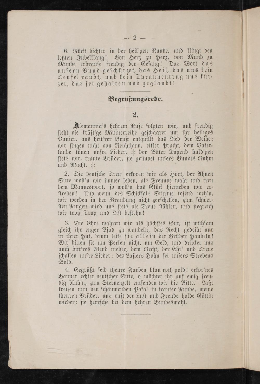 Alemannia's hehrem Rufe folgten wir, und freudig ſteht die kräft'ge Männerreihe geſchaaret um ihr heiliges Panier, aus heit'rer Bruſt entquillt das Lied der Weihe; wir ſingen nicht von Reichthum, eitler Pracht, dem Vater⸗ lande tönen unſre Lieder, ꝛ: der Väter Tugend huld'gen ſtets wir, traute Brüder, ſie gründet unſers Bundes Ruhm und Macht.::