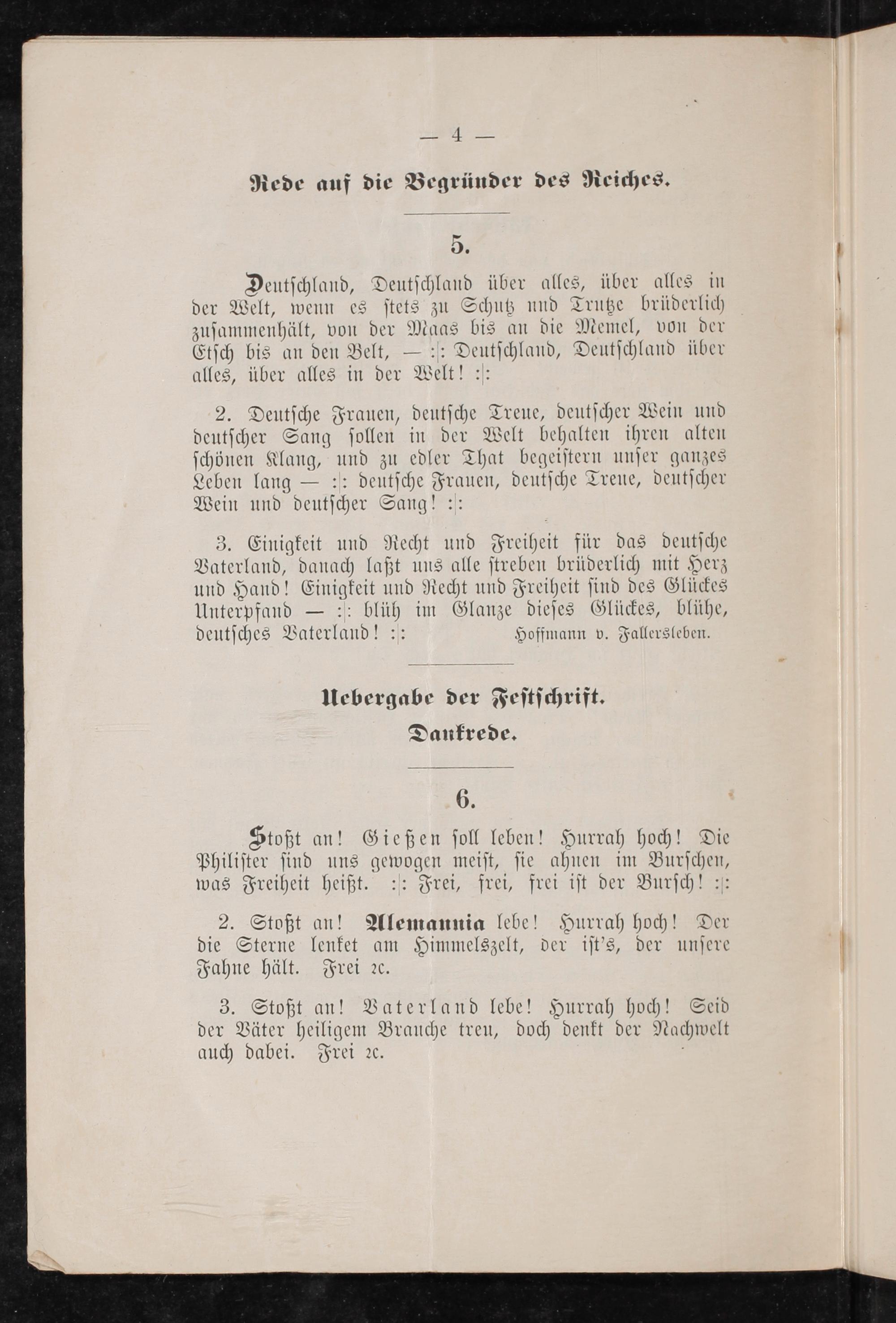 3. Stoßt an! Vaterland lebe! Hurrah hoch! Seid der Väter heiligem Brauche treu, doch denkt der Nachwelt auch dabei. Frei ec.