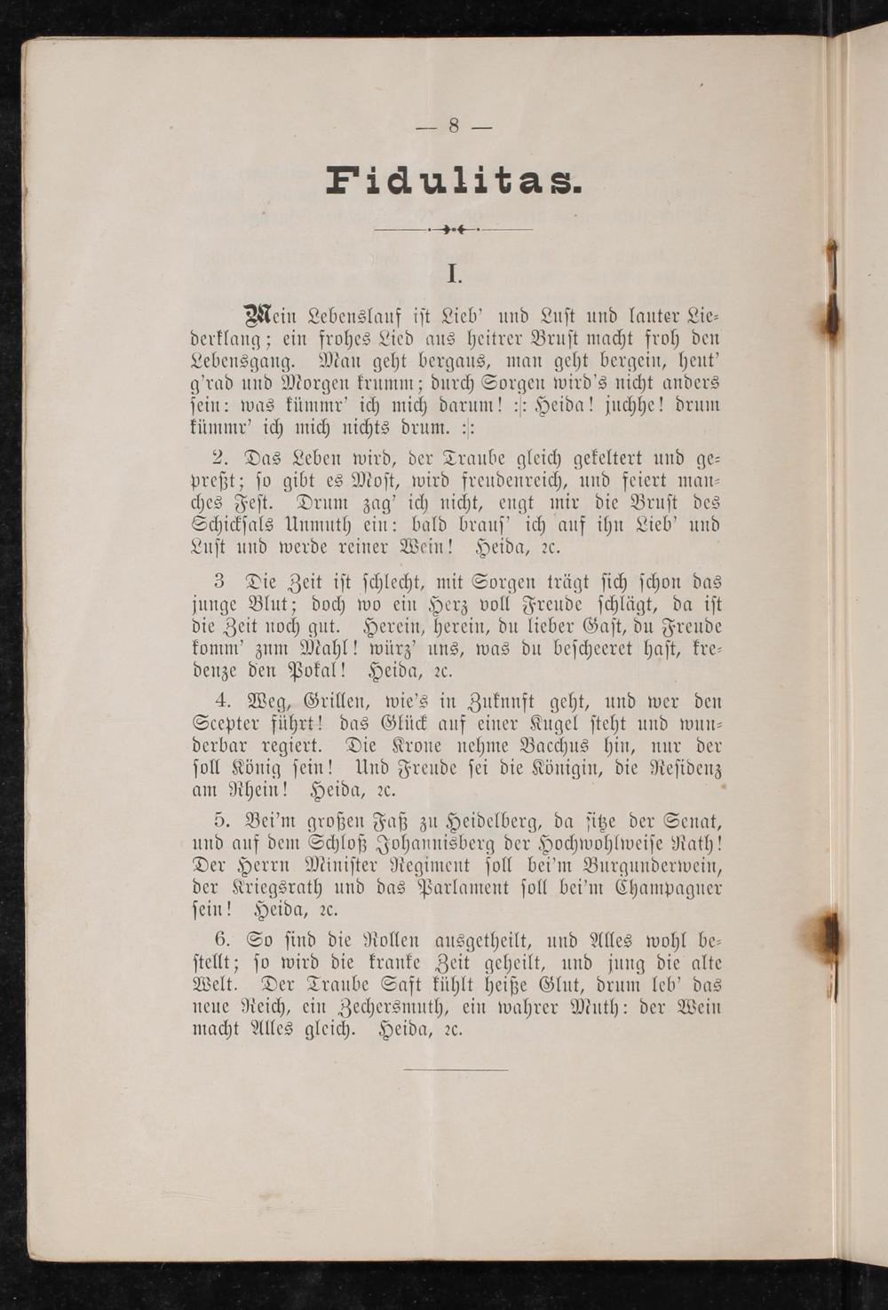 5. Bei'm großen Faß zu Heidelberg, da ſitze der Senat, und auf dem Schloß Johannisberg der Hochwohlweiſe Rath! Der Herrn Miniſter Regiment ſoll bei'm Burgunderwein, der Kriegsrath und das Parlament ſoll bei'm Champagner ſein! Heida, ꝛc.