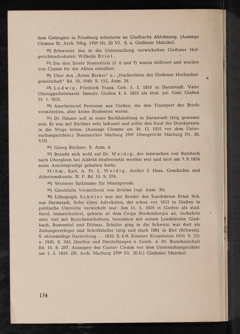 31) Dr. Häuser soll in einer Buchhandlung in Darmstadt tätig gewesen sein. Er war mit Büchner sehr bekannt und sollte den Kauf der Druckpresse in die Wege leiten.(Aussage Clemms am 30. 12. 1835 vor dem Unter- suchungsrichter.) Staatsarchiv Marburg 270e Obergericht Marburg Nr. 20, VIII.