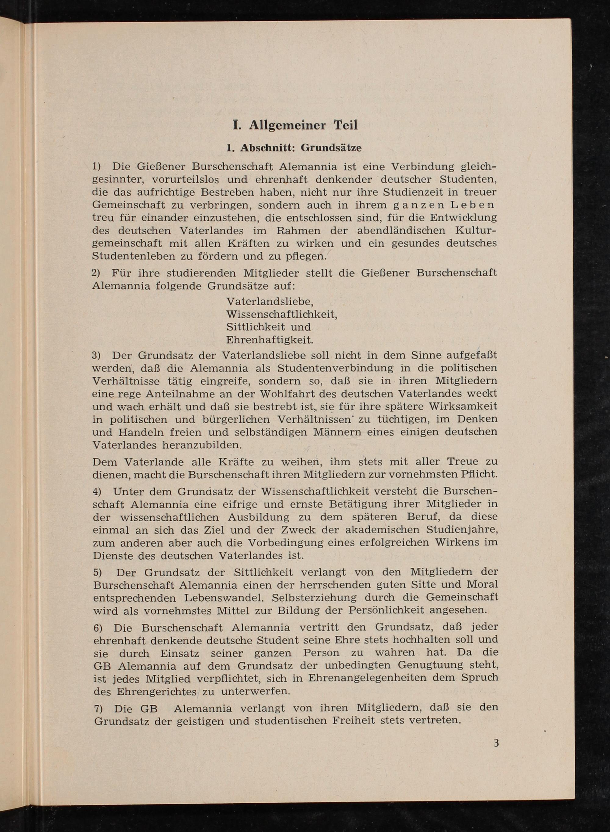 1) Die Gießener Burschenschaft Alemannia ist eine Verbindung gleich- gesinnter, vorurteilslos und ehrenhaft denkender deutscher Studenten, die das aufrichtige Bestreben haben, nicht nur ihre Studienzeit in treuer Gemeinschaft zu verbringen, sondern auch in ihrem ganzen Leben treu für einander einzustehen, die entschlossen sind, für die Entwicklung des deutschen Vaterlandes im Rahmen der abendländischen Kultur- gemeinschaft mit allen Kräften zu wirken und ein gesundes deutsches Studentenleben zu fördern und zu pflegen.