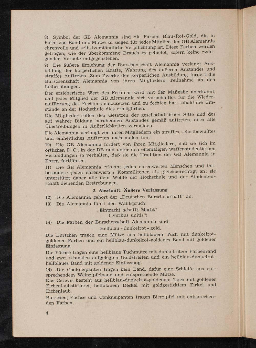 8) Symbol der GB Alemannia sind die Farben Blau-Rot-Gold, die in Form von Band und Mütze zu zeigen für jedes Mitglied der GB Alemannia ehrenvolle und selbstverständliche Verpflichtung ist. Diese Farben werden getragen, wie der überkommene Brauch es gebietet, sofern keine zwin- genden Verbote entgegenstehen. 9) Die äußere Erziehung der Burschenschaft Alemannia verlangt Aus- bildung der körperlichen Kräfte, Wahrung des äußeren Anstandes und straffes Auftreten. Zum Zwecke der körperlichen Ausbildung fordert die Burschenschaft Alemannia von ihren Mitgliedern Teilnahme an den Leibesübungen. Der erzieherische Wert des Fechtens wird mit der Maßgabe anerkannt, daß jedes Mitglied der GB Alemannia sich vorbehaltlos für die Wieder- einführung des Fechtens einzusetzen und zu fechten hat, sobald die Um- stände an der Hochschule dies ermöglichen. Die Mitglieder sollen den Gesetzen der gesellschaftlichen Sitte und des auf wahrer Bildung beruhenden Anstandes gemäß auftreten, doch alle Ubertreibungen in Kußerlichkeiten vermeiden. Die Alemannia verlangt von ihren Mitgliedern ein straffes, selbstbewußtes und einheitliches Auftreten nach außen hin. 10) Die GB Alemannia fordert von ihren Mitgliedern, daß sie sich im örtlichen D. C., in der DB und unter den ehemaligen waffenstudentischen Verbindungen so verhalten, daß sie die Tradition der GB Alemannia in Ehren fortführen. 11) Die GB Alemannia erkennt jeden ehrenwerten Menschen und ins- besondere jeden ehrenwerten Kommilitonen als gleichberechtigt an; sie unterstützt daher alle dem Wohle der Hochschule und der Studenten- schaft dienenden Bestrebungen. 2. Abschnitt: Außere Verfassung 12) Die Alemannia gehört der„Deutschen Burschenschaft“ an. 13) Die Alemannia führt den Wahlspruch: „Eintracht schafft Macht“ („viribus unitis“) 14) Die Farben der Burschenschaft Alemannia sind: Hellblau- dunkelrot- gold. Die Burschen tragen eine Mütze aus hellblauem Tuch mit dunkelrot- goldenen Farben und ein hellblau-dunkelrot-goldenes Band mit goldener Einfassung. Die Füchse tragen eine hellblaue Tuchmütze mit dunkelrotem Farbenrand und zwei schmalen aufgelegten Goldstreifen und ein hellblau-dunkelrot- hellblaues Band mit goldener Einfassung. 14) Die Conkneipanten tragen kein Band, dafür eine Schleife aus ent- sprechendem Weinzipfelband und entsprechende Mütze. Das Cerevis besteht aus hellblau-dunkelrot-goldenem Tuch mit goldener Eichenlaubstickerei, hellblauem Deckel mit goldgesticktem Zirkel und Eichenlaub. Burschen, Füchse und Conkneipanten tragen Bierzipfel mit entsprechen- den Farben.