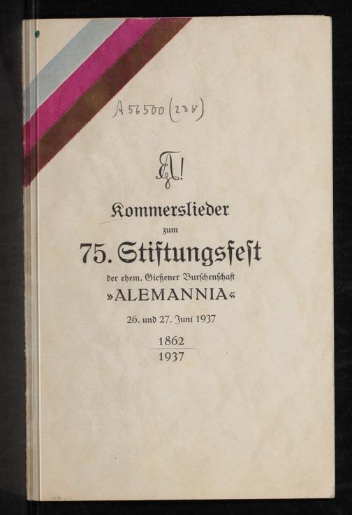 Kommerslieder zum 75. Stiftungsfeſt der ehem. Gießener Burſchenſchaft »ALEMXNNIAS 26. und 27. Juni 1937 4362 1937