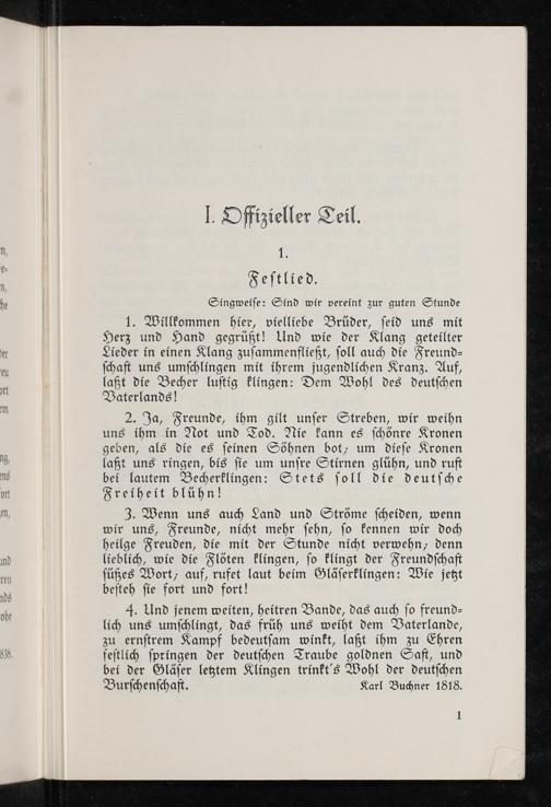 4. Und jenem weiten, heitren Bande, das auch ſo freund⸗ lich uns umſchlingt, das früh uns weiht dem Vaterlande, zu ernſtrem Kampf bedeutſam winkt, laßt ihm zu Ehren feſtlich ſpringen der deutſchen Traube goldnen Saft, und bei der Gläſer letztem Klingen trinkt's Wohl der deutſchen Burſchenſchaft. Karl Buchner 1818.