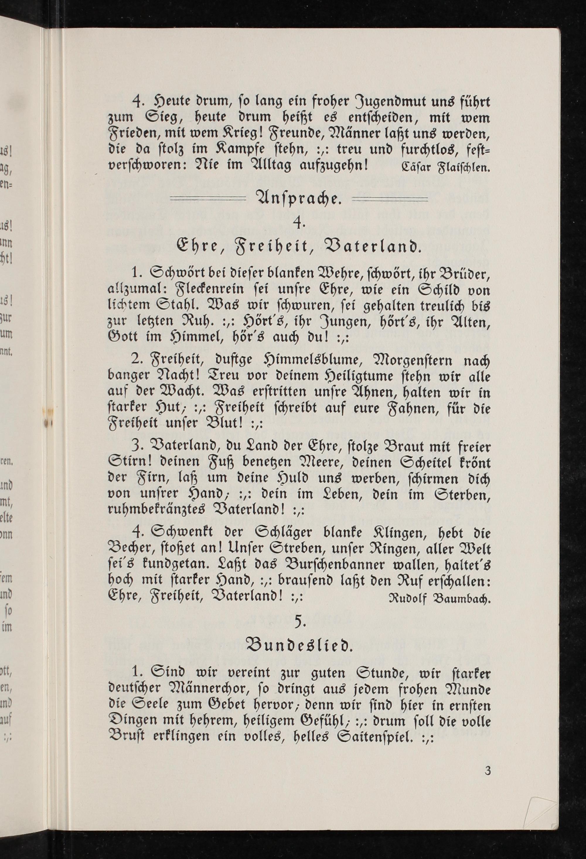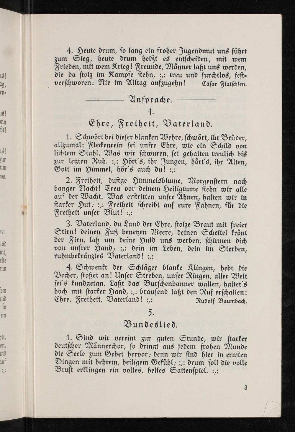 4. Schwenkt der Schläger blanke Klingen, hebt die Becher, ſtoßet an! Unſer Streben, unſer Ringen, aller Welt ſeis kundgetan. Laßt das Burſchenbanner wallen, haltet's hoch mit ſtarker Hand,:,: brauſend laßt den Ruf erſchallen: Ehre, Freiheit, Vaterland!:,: Rudolf Baumbach.