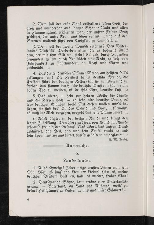 4. Das dritte, deutſcher Männer Weide, am hellſten ſoll's geklungen ſein! Die Freiheit heißet deutſche Freude, die Freiheit führt den deutſchen Reihn, für ſie zu leben und zu ſterben, das flammt durch jede deutſche Bruſt,:,: für ſie um hohen Tod zu werben, iſt deutſche Ehre, deutſche Luſt.:;