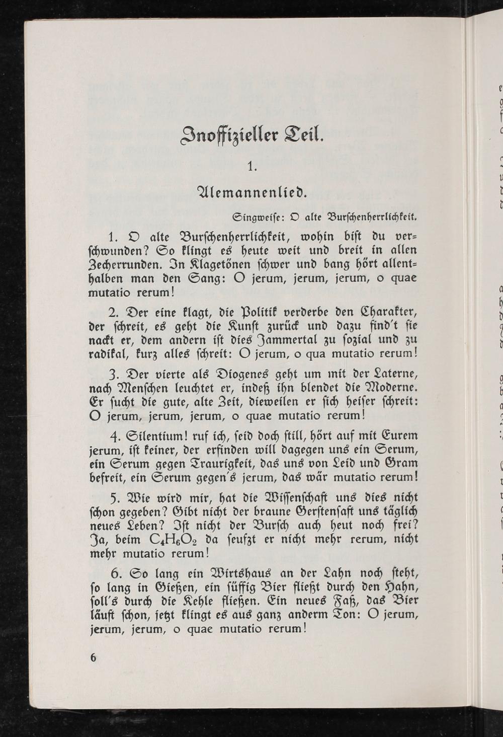 6. So lang ein Wirtshaus an der Lahn noch ſteht, ſo lang in Gießen, ein ſüffig Bier fließt durch den Hahn, ſoll's durch die Kehle fließen. Ein neues Faß, das Bier läuft ſchon, jetzt klingt es aus ganz anderm Ton: O jerum, jerum, jerum, o quae mutatio rerum!