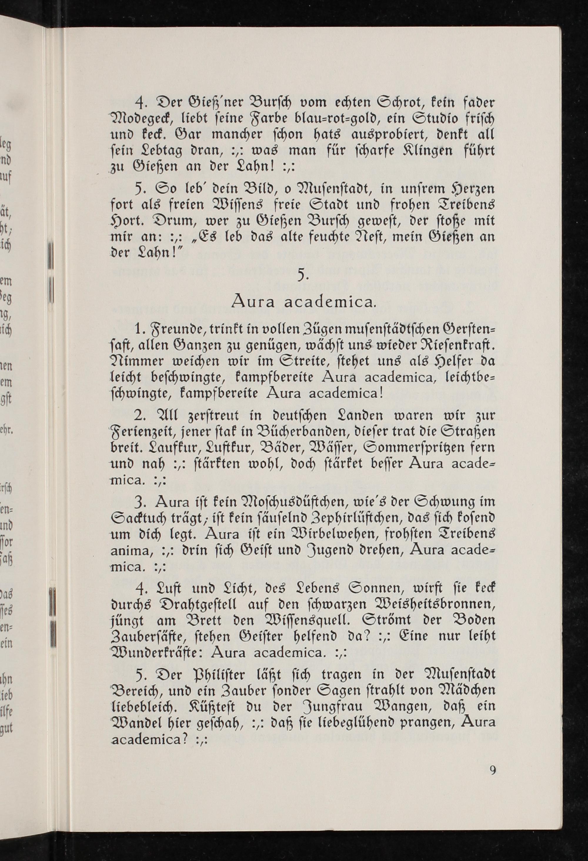 5. Der Philiſter läßt ſich tragen in der Muſenſtadt Bereich, und ein Zauber ſonder Sagen ſtrahlt von Mädchen liebebleich. Küßteſt du der Jungfrau Wangen, daß ein Wandel hier geſchah,:,: daß ſie liebeglühend prangen, Aura academica?:;
