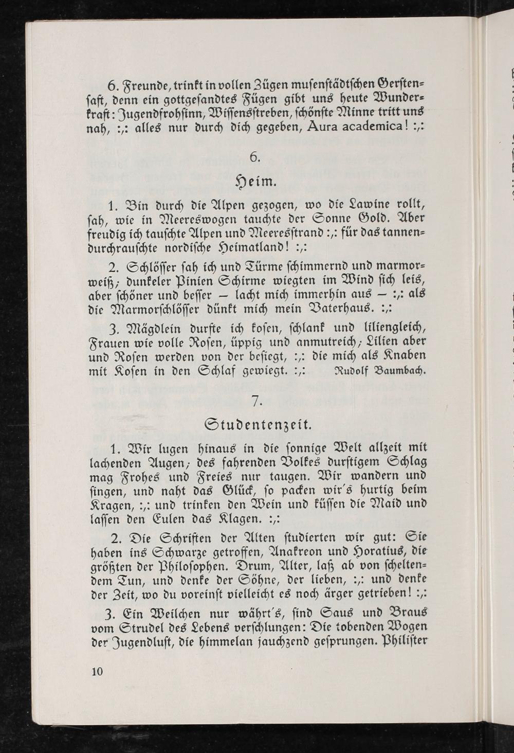 6. Freunde, trinkt in vollen Zügen muſenſtädtſchen Gerſten⸗ ſaft, denn ein gottgeſandtes Fügen gibt uns heute Wunder⸗ kraft: Jugendfrohſinn, Wiſſensſtreben, ſchönſte Minne tritt uns nah,“: alles nur durch dich gegeben, Aura academica!:,: