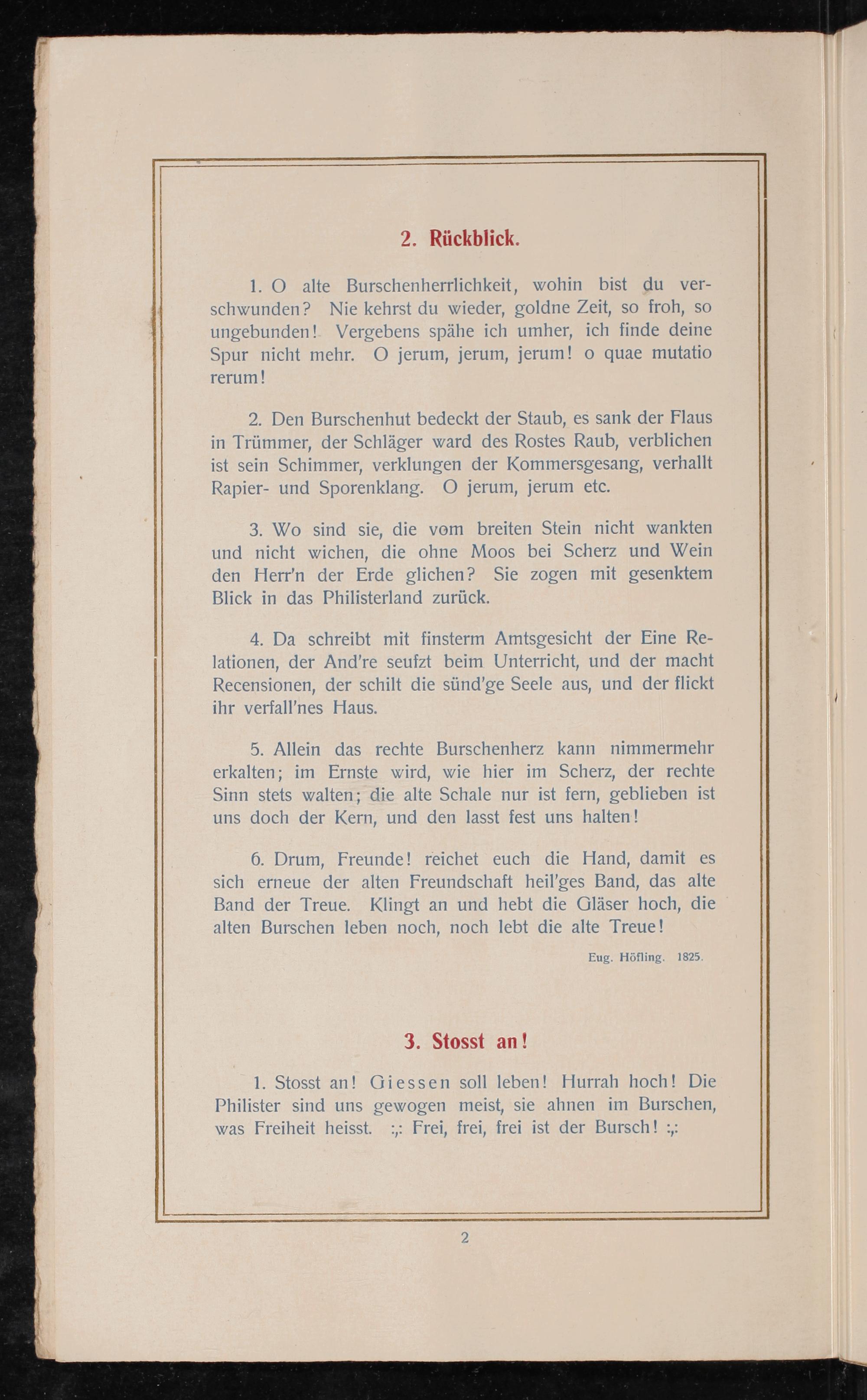 1. Stosst an! Giessen soll leben! Hurrah hoch! Die Philister sind uns gewogen meist, sie ahnen im Burschen, was Freiheit heisst.: Frei, frei, frei ist der Bursch!:;