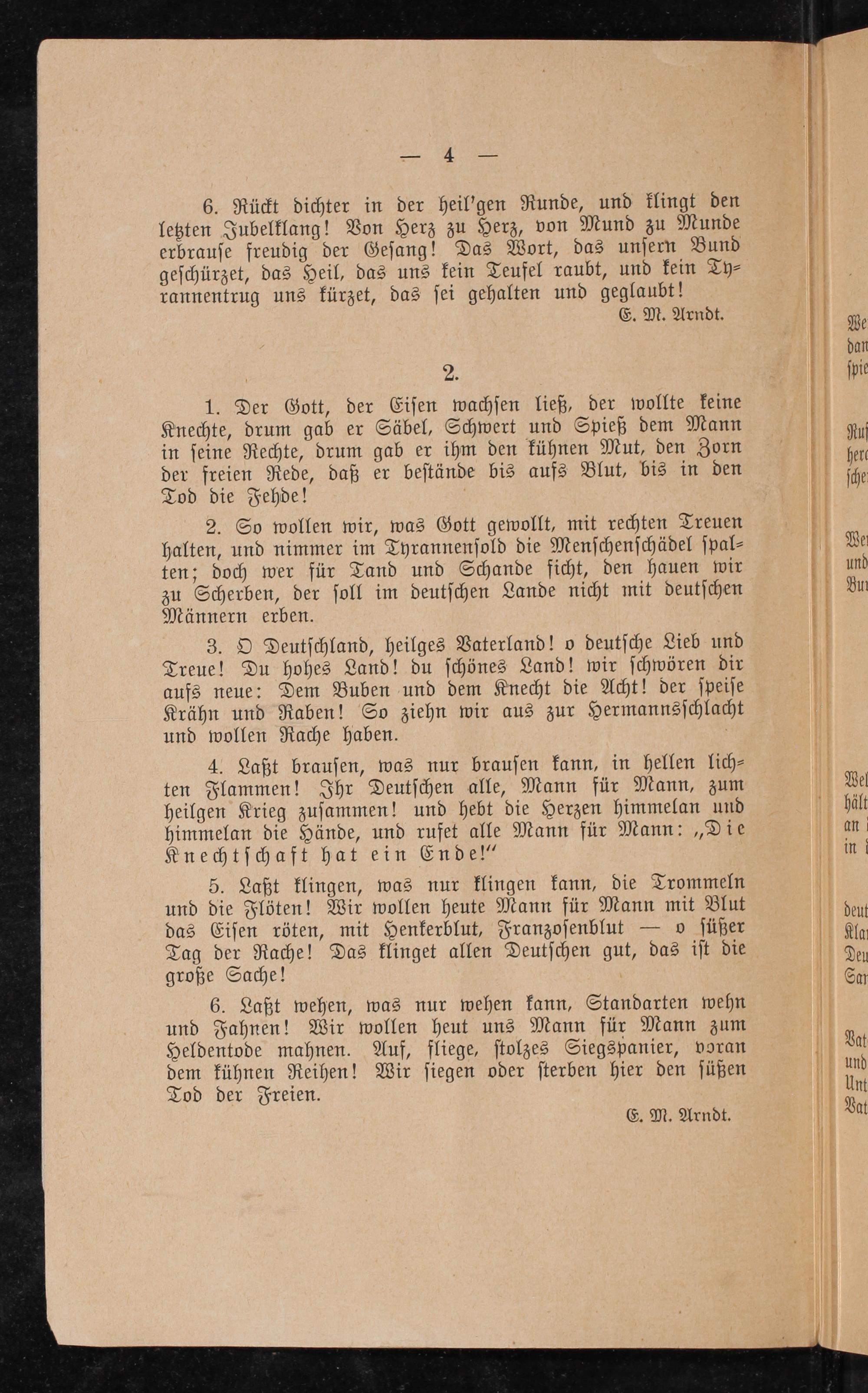 5. Laßt klingen, was nur klingen kann, die Trommeln und die Flöten! Wir wollen heute Mann für Mann mit Blut das Eiſen röten, mit Henkerblut, Franzoſenblut— o ſüßer Tag der Rache! Das klinget allen Deutſchen gut, das iſt die große Sache!