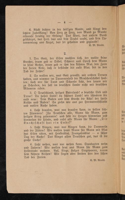 1. Der Gott, der Eiſen wachſen ließ, der wollte keine Knechte, drum gab er Säbel, Schwert und Spieß dem Mann in ſeine Rechte, drum gab er ihm den kühnen Mut, den Zorn der freien Rede, daß er beſtände bis aufs Blut, bis in den Tod die Fehde!