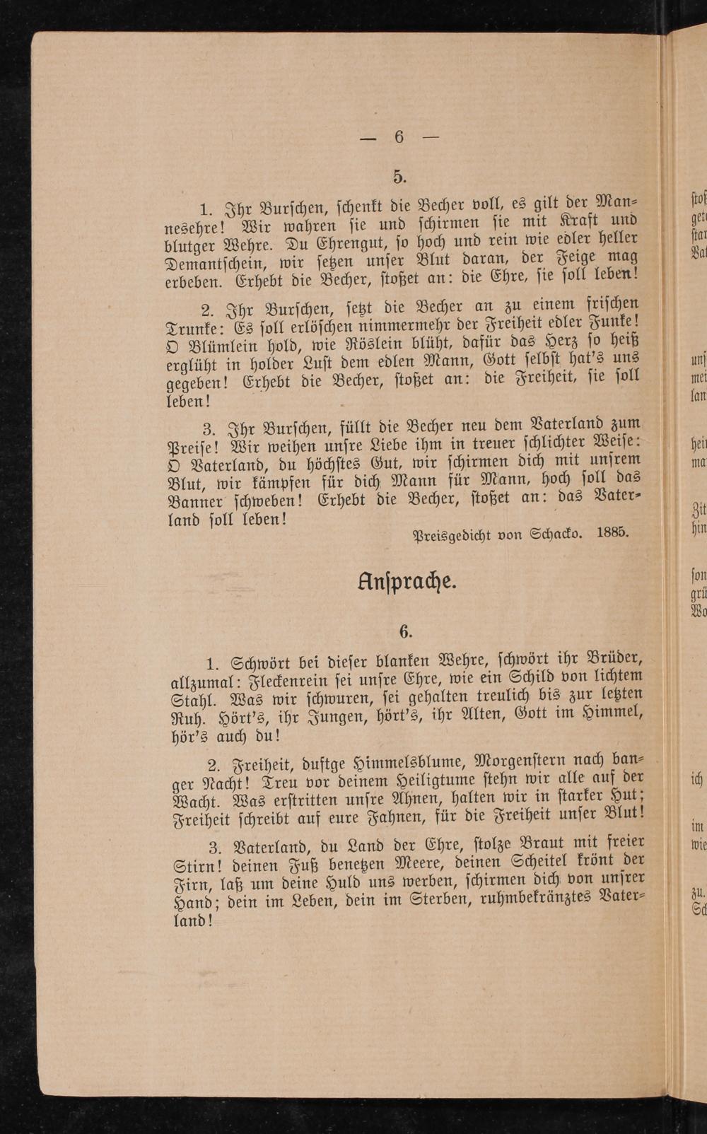 3. Ihr Burſchen, füllt die Becher neu dem Vaterland zum Preiſe! Wir weihen unſre Liebe ihm in treuer ſchlichter Weiſe: O Vaterland, du höchſtes Gut, wir ſchirmen dich mit unſrem Blut, wir kämpfen für dich Mann für Mann, hoch ſoll das Banner ſchweben! Erhebt die Becher, ſtoßet an: das Vater⸗