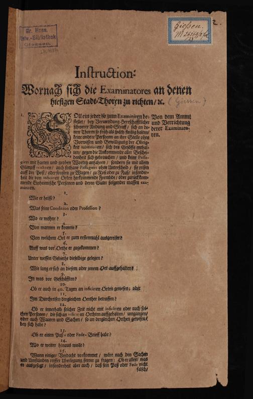 7. Unter weſſen Gebiethe dieſelbige gelegen? 8. Wie lang er ſich an dieſem oder jenem Ort auffgehalten . 9. In was vor Geſchaͤfften? 10. Ob er auch in 40. Tagen an inficirten Orten geweſen; oder 11. Im Durchreiſen dergleichen Oerther betroffen? 12². 4 Ob er innerhalb ſolcher Zeit nicht mit inkcinen oder auch ſol⸗ chen Perſonen/ die ſich an innem en Orthten auffgehalten/ umgangen/ oder auch Waaren und Sachen/ ſo an dergleichen Orthen geweſen! bey ſich habe? 1 3.. Ob er einen Paß⸗ oder Fede- Brieff habe? 14. Wo er weiter hinaus wolle? 15... Wann einiger Verdacht vorkommet/ waͤre nach den Sachen