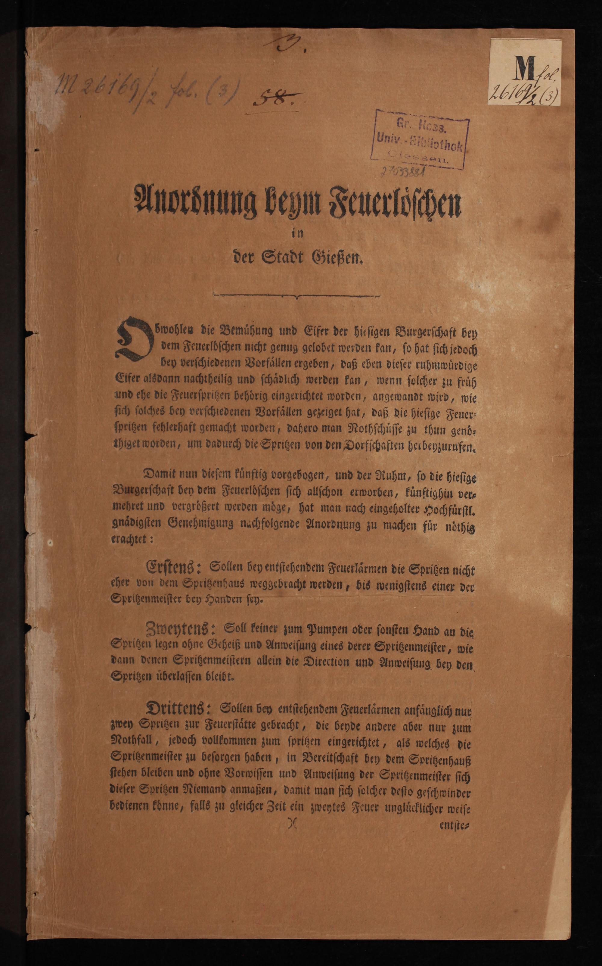 Damit nun dieſem kuͤnftig vorgebogen, und der Ruhm, ſo die hieſige Busgerſchaft bey dem Feuerloſchen ſich allſchon erworben, künftighin ver⸗ mehret und vergroͤßert werden moͤge, hat man nach eingeholter Hochfuͤrſtl. gnaͤdigſten Genehmigung nochfolgende Anordnung zu machen fuͤr noͤthig erachtet: