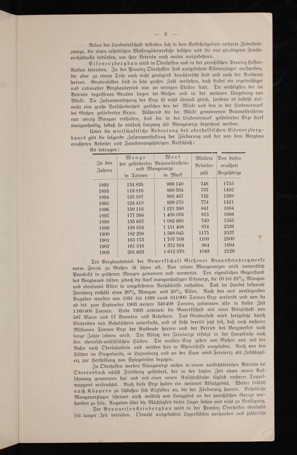 Der Brauneiſenſteinbergbau wird in der Provinz Oberheſſen ebenfalls ſeit langer Zeit betrieben. Obwohl ausgedehnte Lagerſtätten vorhanden und zahlreiche