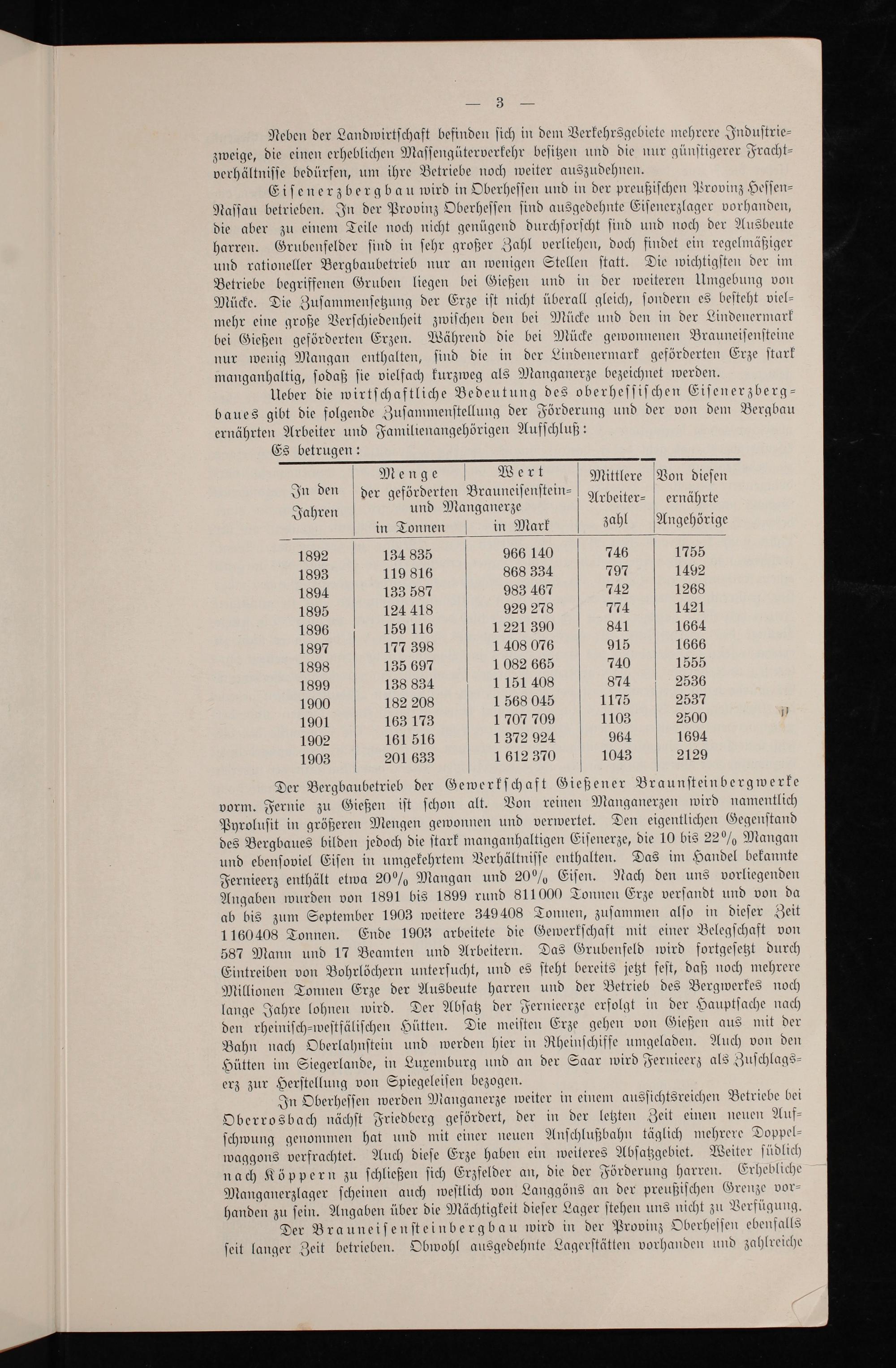 Der Bergbaubetrieb der Gewerkſchaft Gießener Braunſteinbergwerke vorm. Fernie zu Gießen iſt ſchon alt. Von reinen Manganerzen wird namentlich Pyroluſit in größeren Mengen gewonnen und verwertet. Den eigentlichen Gegenſtand des Bergbaues bilden jedoch die ſtark manganhaltigen Eiſenerze, die 10 bis 22% Mangan und ebenſoviel Eiſen in umgekehrtem Verhältniſſe enthalten. Das im Handel bekannte Fernieerz enthält etwa 20% Mangan und 20% Eiſen. Nach den uns vorliegenden Angaben wurden von 1891 bis 1899 rund 811000 Tonnen Erze verſandt und von da ab bis zum September 1903 weitere 349 408 Tonnen, zuſammen alſo in dieſer Zeit 1160 408 Tonnen. Ende 1903 arbeitete die Gewerkſchaft mit einer Belegſchaft von 587 Mann und 17 Beamten und Arbeitern. Das Grubenfeld wird fortgeſetzt durch Eintreiben von Bohrlöchern unterſucht, und es ſteht bereits jetzt feſt, daß noch mehrere Millionen Tonnen Erze der Ausbeute harren und der Betrieb des Bergwerkes noch lange Jahre lohnen wird. Der Abſatz der Fernieerze erfolgt in der Hauptſache nach den rheiniſch-weſtfäliſchen Hütten. Die meiſten Erze gehen von Gießen aus mit der Bahn nach Oberlahnſtein und werden hier in Rheinſchiffe umgeladen. Auch von den Hütten im Siegerlande, in Luxemburg und an der Saar wird Fernieerz als Zuſchlags⸗ erz zur Herſtellung von Spiegeleiſen bezogen.