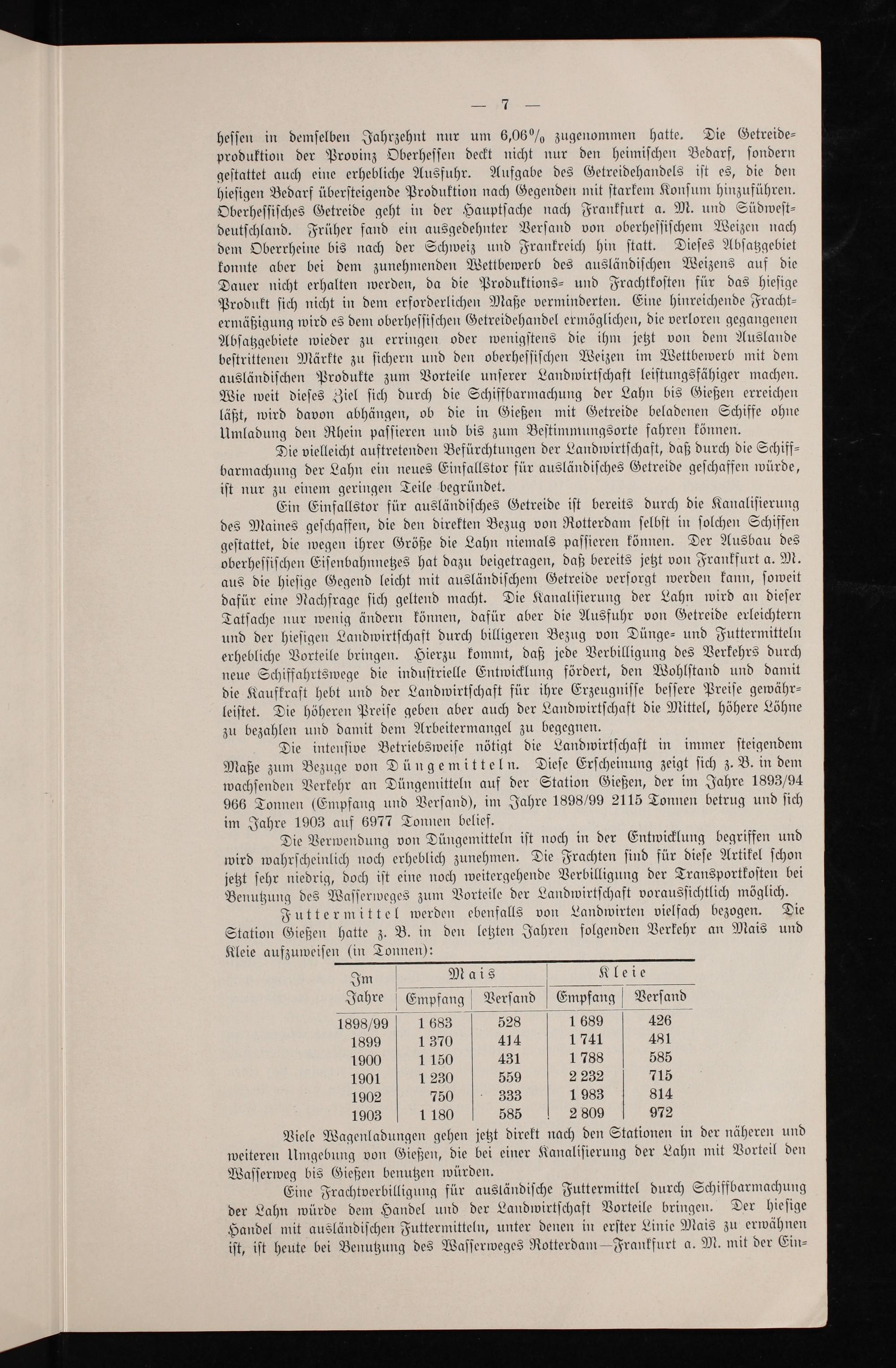 Im V Mais Kleie Jahre V Empfang Verſand Empfang V Verſand 1898/99 1 683 528 1 689 426 1899 1 370 414 1 741 481 1900 1 150 431 1 788 585 1901 1 230 559 2 232 715 1902 750 333 1 983 814 1903 1 180 58⁵ 2 809 972