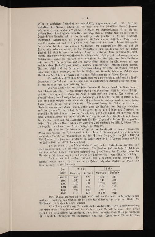 Futtermittel werden ebenfalls von Landwirten vielfach bezogen. Die Station Gießen hatte z. B. in den letzten Jahren folgenden Verkehr an Mais und Kleie aufzuweiſen(in Tonnen):