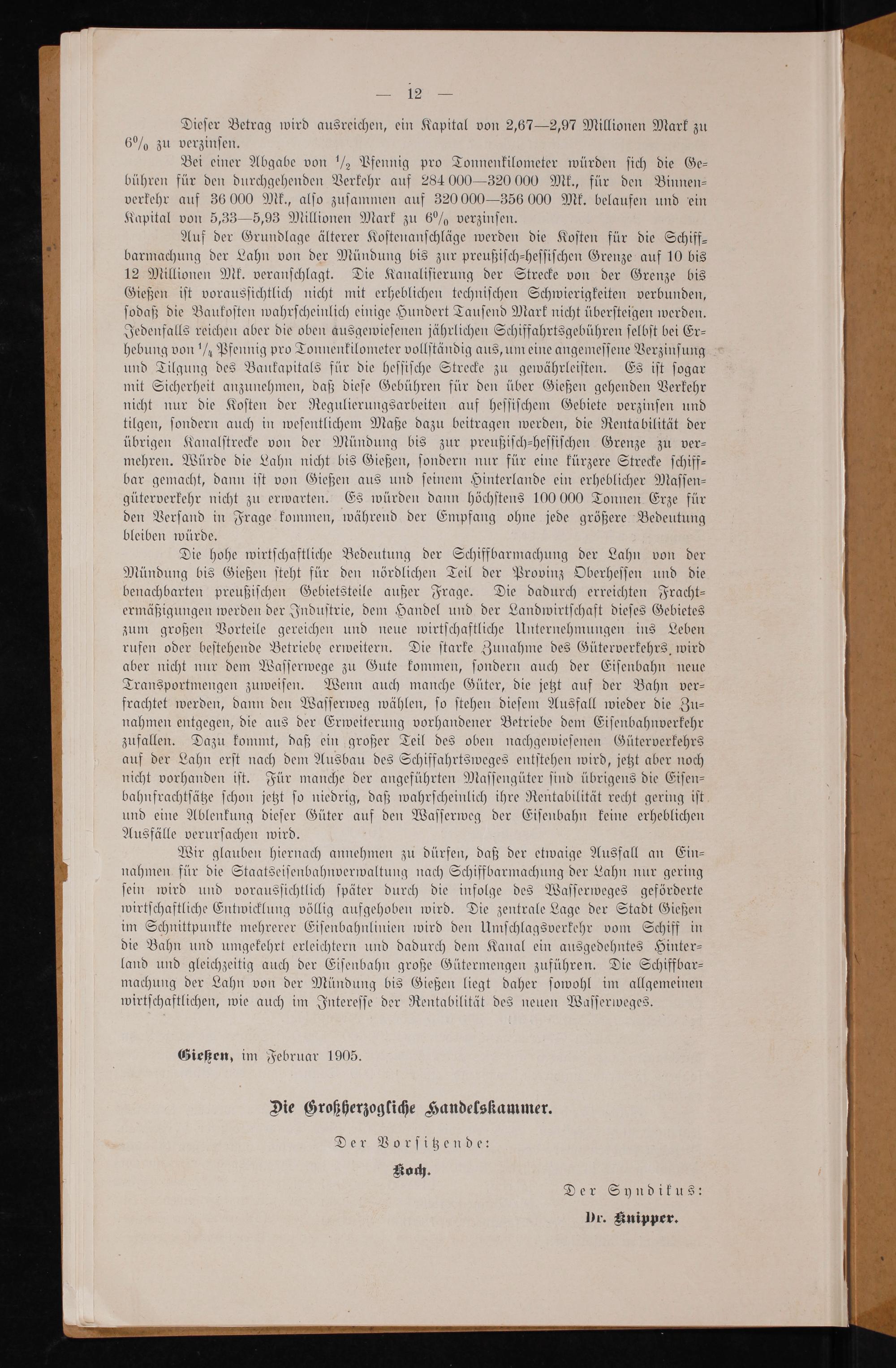 Auf der Grundlage älterer Koſtenanſchläge werden die Koſten für die Schiff⸗ barmachung der Lahn von der Mündung bis zur preußiſch⸗heſſiſchen Grenze auf 10 bis 12 Millionen Mk. veranſchlagt. Die Kanaliſierung der Strecke von der Grenze bis Gießen iſt vorausſichtlich nicht mit erheblichen techniſchen Schwierigkeiten verbunden, ſodaß die Baukoſten wahrſcheinlich einige Hundert Tauſend Mark nicht überſteigen werden. Jedenfalls reichen aber die oben ausgewieſenen jährlichen Schiffahrtsgebühren ſelbſt bei Er⸗ hebung von ½ Pfennig pro Tonnenkilometer vollſtändig aus, um eine angemeſſene Verzinſung und Tilgung des Baukapitals für die heſſiſche Strecke zu gewährleiſten. Es iſt ſogar mit Sicherheit anzunehmen, daß dieſe Gebühren für den über Gießen gehenden Verkehr nicht nur die Koſten der Regulierungsarbeiten auf heſſiſchem Gebiete verzinſen und tilgen, ſondern auch in weſentlichem Maße dazu beitragen werden, die Rentabilität der übrigen Kanalſtrecke von der Mündung bis zur preußiſch⸗-heſſiſchen Grenze zu ver⸗ mehren. Würde die Lahn nicht bis Gießen, ſondern nur für eine kürzere Strecke ſchiff⸗ bar gemacht, dann iſt von Gießen aus und ſeinem Hinterlande ein erheblicher Maſſen⸗ güterverkehr nicht zu erwarten. Es würden dann höchſtens 100 000 Tonnen Erze für den Verſand in Frage kommen, während der Empfang ohne jede größere Bedeutung bleiben würde.