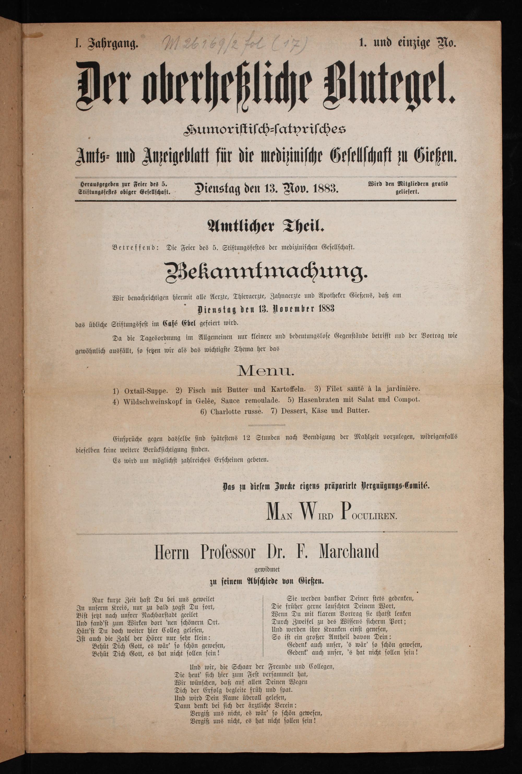 Wir benachrichtigen hiermit alle Aerzte, Thieraerzte, Zahnaerzte und Apotheker Gießens, daß am gdienstag den 13. Uovember 1883 das übliche Stiftungsfeſt im Café Ebel gefeiert wird. Da die Tagesordnung im Allgemeinen nur kleinere und bedeutungsloſe Gegenſtände betrifft und der Vortrag wie