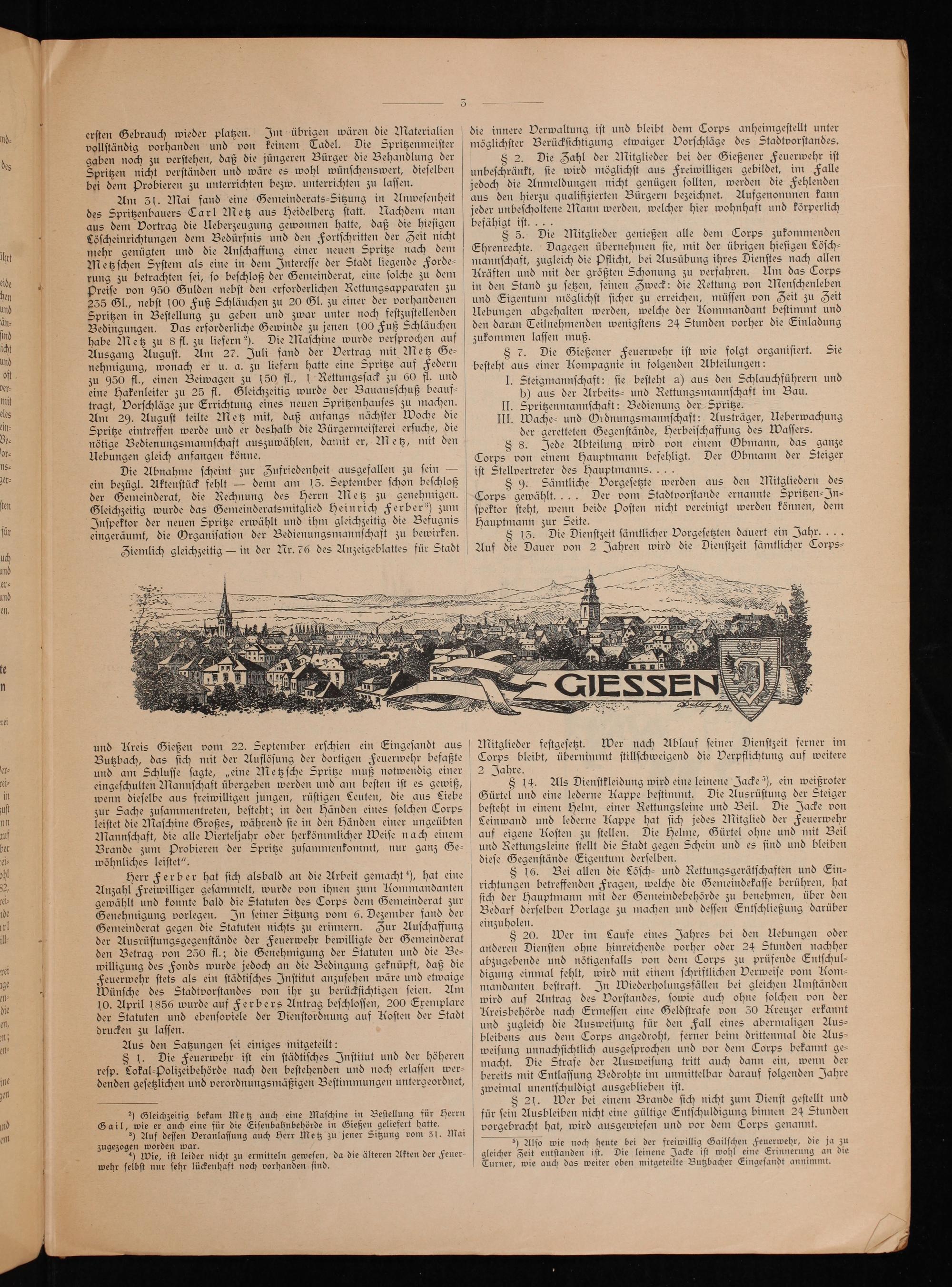 § 2. Die Zahl der Mitglieder bei der Gießener Feuerwehr iſt unbeſchränkt, ſie wird möglichſt aus Freiwilligen gebildet, im Falle jedoch die Anmeldungen nicht genügen ſollten, werden die Fehlenden aus den hierzu qualifizierten Bürgern bezeichnet. Aufgenommen kann jeder unbeſcholtene Mann werden, welcher hier wohnhaft und körperlich befähigt iſt....