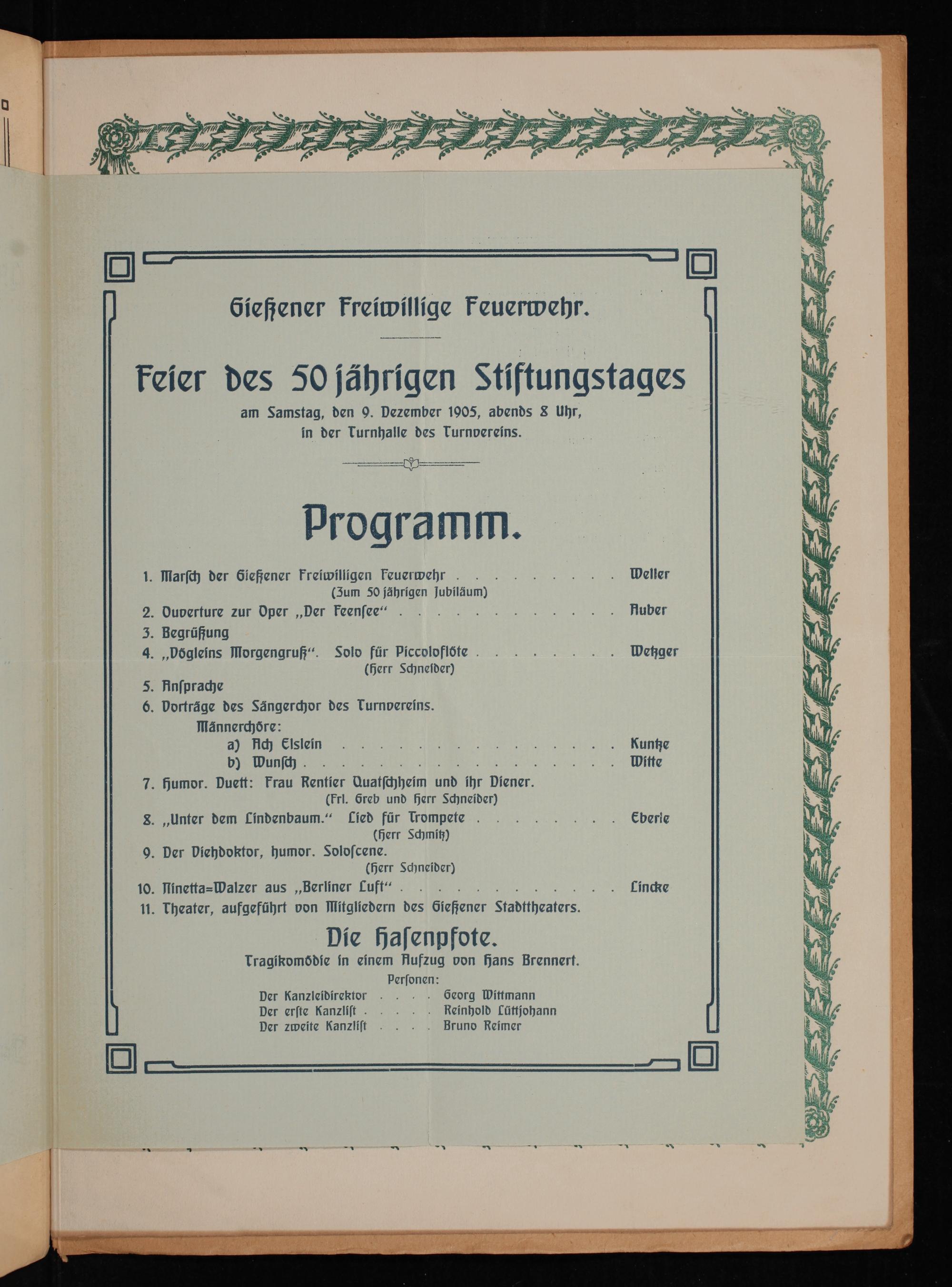 feier des 50 jährigen Stiftungstages am Samstag, den 90. Dezember 1005, abends§ Uhr, in der Turnhalle des Turnvereins.