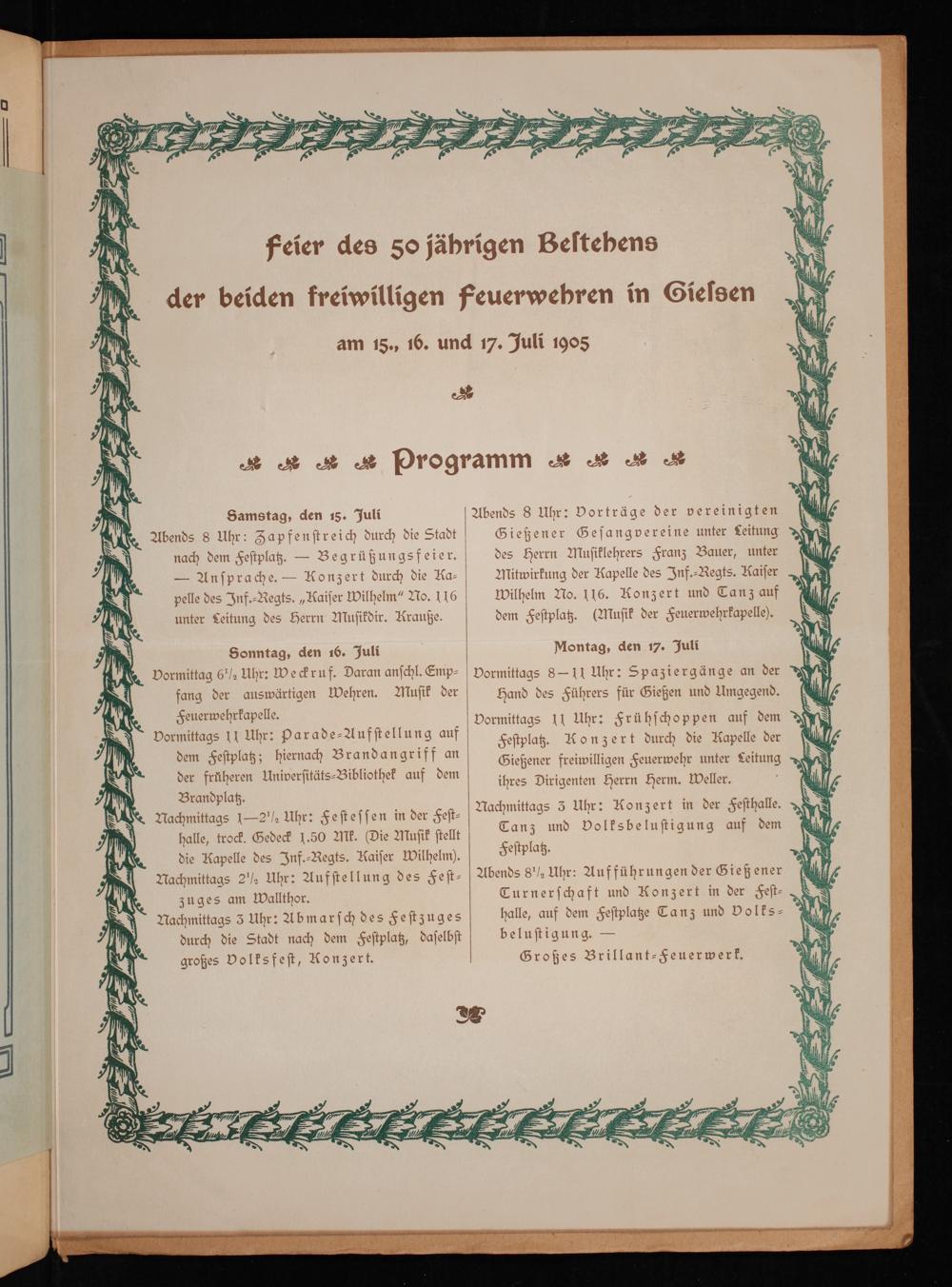 Vormittags 11 Uhr: Frühſchoppen auf dem Feſtplatz. Konzert durch die Kapelle der Gießener freiwilligen Feuerwehr unter Leitung ihres Dirigenten Herrn Herm. Weller.