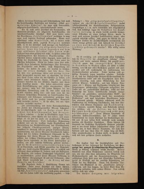 Anhang 4— kein„allgemeinkonfeſſioneller“, ſondern ein„chriſtlich⸗konfeſſioneller“, wobei ſelbſtverſtändlich die Konfeſſionsloſen, Religionsloſen, Ungläubigen u. ſ. w. auf's friedlichſte mit eingeſchloſſen ſind, dies beſtätigt ſogar die Redaktion der Frank⸗ furter Zeitung in einem frellich ziemlich verwor⸗ renen Schreiben an einen hieſigen Herrn, worin ſie wohl auch unſeren Friedhof konfeſſionslos nennt, aber zugleich wörtlich erklärt,„daß gegen die Abſicht der zu⸗ ſtändigen Stellen die Friedhofskapelle verſehentlich mit einem Kreuze gekrönt und daß dadurch der Friedhof zu einer ausſchließlichchriſtlichen Begräb⸗ nisſtätte geſtempelt wurde“. Alſo völlig unſere Meinung! 2.