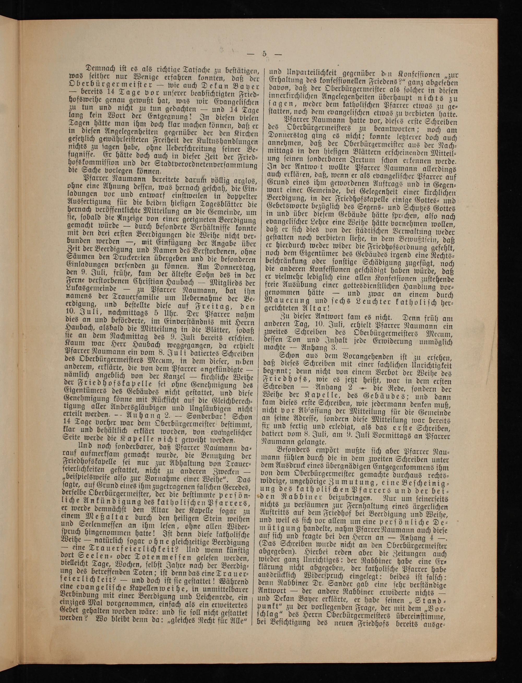 Schon aus dem Voran daß dieſes Schreiben mit ei begennt; denn nicht von ein Triedhofs, wie es jetzt heißt, war in dem erſten Schreiben— Anhang 2— die Redo, ſondern der Weihe der Kapelle, des Gebäudes; und dann kam dieſes erſte Schreiben, wie jedermann denken muß, nicht vor Abfaſſung der Mitteilung für die Gemeinde an ſeine Adreſſe, ſondern dieſe Mitteilung war bereits fir und fertig und erledigt, als das erſte Schreiben, datiert vom 8. Juli, am 9. Juli Vormittags an Pfarrer Naumann gelangte.