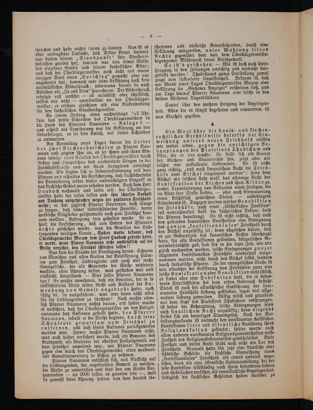 Ein Wort über die ſtaats⸗ und kirchen⸗ rechtlichen Verhältniſſe betreffs der Ein⸗ weihung unſeres neuen Friedhofs müſſen wir weiter reden, gegen die unrichtigen Be⸗ hauptungen des Profeſſors Thudichum und Aller, die er irre machte. Er ſtellt ſich als Kenner des Kirchen⸗ und Staatsrechts hin, zeigt aber als ſolcher eine auffallende Unkenntnis. Es iſt nicht ganz richtig,„daß nach kanoniſchem Recht die Fried⸗ höfe vom Biſchof eingeſegnet werden“; denn dem Biſchof als ſolchem ſteht wohl das alleinige Recht der Konſekration der Kirchen und ihrer Altäre zu, wobei Transferierung von Reliquien eines Heiligen, die im Altar ihre Stelle finden,— oder auch Einmauerung eines biſchöflich geweihten Steins— unbedingtes Erfordernis iſt. Dagegen werden mit der Benediktion der Friedhöfe, auch einer„biſchöflichen Funktion“ faſt ausnahmslos bald die katholiſchen Dekane, bald die Pfarrer beauftragt. Es iſt nicht richtig, daß nach den geltenden kanoniſchen Vorſchriften eine Einſegnung des ganzen„konfeſſions loſen“ Friedhofs durch den Biſchof unzuläſſig ſei; denn abgeſehen davon, daß es zur Geburtszeit des kanoniſchen Rechts überhaupt keine, für alle Konfeſſionen geltenden, bürgerlichen Ge⸗ meindefriedhöfe gab, ſind bis in die letzte Zeit, wie wir gleich nachweiſen werden, ſolche Einſegnungen ganzer allgemein konfeſſionellen Friedhöfe wiederholt vorge⸗ nommen worden, nicht durch den Biſchof ſelbſt, ſondern durch katholiſche Pfarrer. In der evangeliſcheu Kirche iſt von altersher bei Eröffnung von Friedhöfen zwar eine ſolche Konſekrationoder Benedikrion nicht üblich, es findet aber eine Dedikation ſtatt, die in beſon⸗ deren Feierlichkeiten bei dem erſten Gebrauch beſteht. Dieſes iſt auch bei allmählicher Einführung der kom⸗ munalen Friedhöfe Uebung geblieben, ſogar viel allge⸗ Völlig falſch und grundlos nur dem Kopf des Proofeſſors Thudichum entſprungen, iſt dabei die Behauptung, ſolche Einſegnungen ſeien nach ſtaatlichem Recht unzuläſſig; denn nirgends findet ſich ein derartiges Staatsgeſetz. Nach der Ver⸗ faſſungsurkunde iſt vielmehr den anerkannten chriſtlichen Konfeſſionen freie und öffent liche Ausübung ihres Religionskultus geſtattet; ſpäter wurde auch allen anderen anerkannten Religionsgemeinſchaften volle Freiheit des Religionsbekenntniſſes gewährleiſtet. Dieſe Freiheit und dieſes Recht ſtirbt auch nicht am Tor des Friedhofs. Niemals hatte bis jetzt eine ſtaatliche oder ſtädtiſche Behörde die kirchliche Einweihung eines „konfeſſionsloſen“ Friedhofs als etwas anderes ange⸗ ſehen, denn als eine öffentliche Kultusausübung, bei der jede Konfeſſion ſelbſtändig nach ihren beſonderen Lehren und Gebräuchen verfährt, als innerkirchliche Angelegenheit. Lediglich die kirchlichen Behörden haben darüber zu
