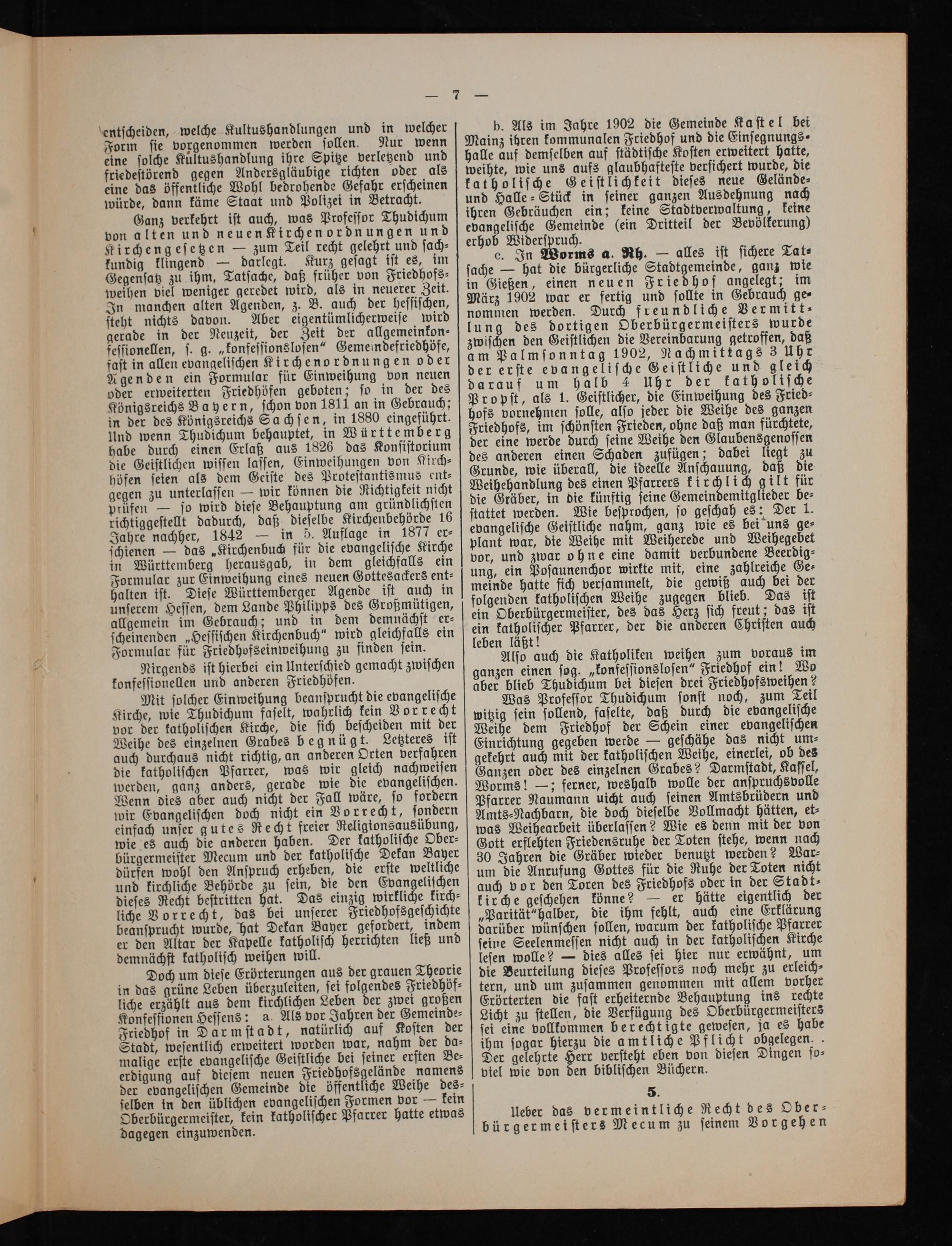 b. Als im Jahre 1902 die Gemeinde Kaſtel bei Mainz ihren kommunalen Friedhof und die Einſegnungs⸗ halle auf demſelben auf ſtädtiſche Koſten erweitert hatte, weihte, wie uns aufs glaubhafteſte verſichert wurde, die katholiſche Geiſtlichkeit dieſes neue Gelände⸗ und Halle⸗Stück in ſeiner ganzen Ausdehnung nach ihren Gebräuchen ein; keine Stadtverwaltung, keine evangeliſche Gemeinde(ein Dritteil der Bevölkerung) erhob Widerſpruch.
