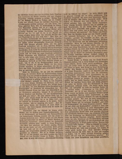 durch die Schlacht bei Lützen“. In dieſer Schrift wird die genannte Schlacht als ein völlig entſchiedener Sieg Napoleons dargeſtellt, der einen jeden bedeutenden Wider⸗ ſtand der Preußen und Ruſſen unmöglich machte. Wohl mochten die Bulletins über dieſe Schlacht, die mir un⸗ bekannt geblieben ſind, eine ſolche Anſicht veranlaſſen. Dieſer deutſche Profeſſor ſchilderte nun die glückliche Zu⸗ kunft Deutſchlands, da die weiſen Pläne des großen Herrſchers keine Hinderniſſe mehr fänden. Ich habe die Schrift ſelbſt nicht geleſen, daß ſie Blücher und ſeine Um⸗ gebung erbitterte, war natürlich.“ Als Blücher nach Gießen kam, hatte ſich Profeſſor Crome aus dem Staube gemacht. „Die nationale Aufregung“, ſagt er in ſeiner Auto⸗ biographie,„gereichte den Deutſchen zur Ehre, und nur die Wahrnehmung einer Beimiſchung ſelbſtiſcher Abſichten konnte den Beſonnenen von der unbedingten Zuſtimmung zurückhalten. Allein bei dem feurigen Schwung, den der deutſche Nationalgeiſt auf einmal erhielt, war an eine ruhige und billige Beurtheilung der mit vieler Mäßigung abgefaßten Schrift, die wider mein Wiſſen und Willen war gedruckt worden, nicht zu denken; es war vielmehr voraus⸗ zuſehen, daß die Gegner der Franzoſen ſchonungslos gegen den Verfaſſer losbrechen würden. Deßhalb beſchloß ich, dem erſten Sturm auszuweichen und eine gelehrte Reiſe in die Schweiz zu machen.“