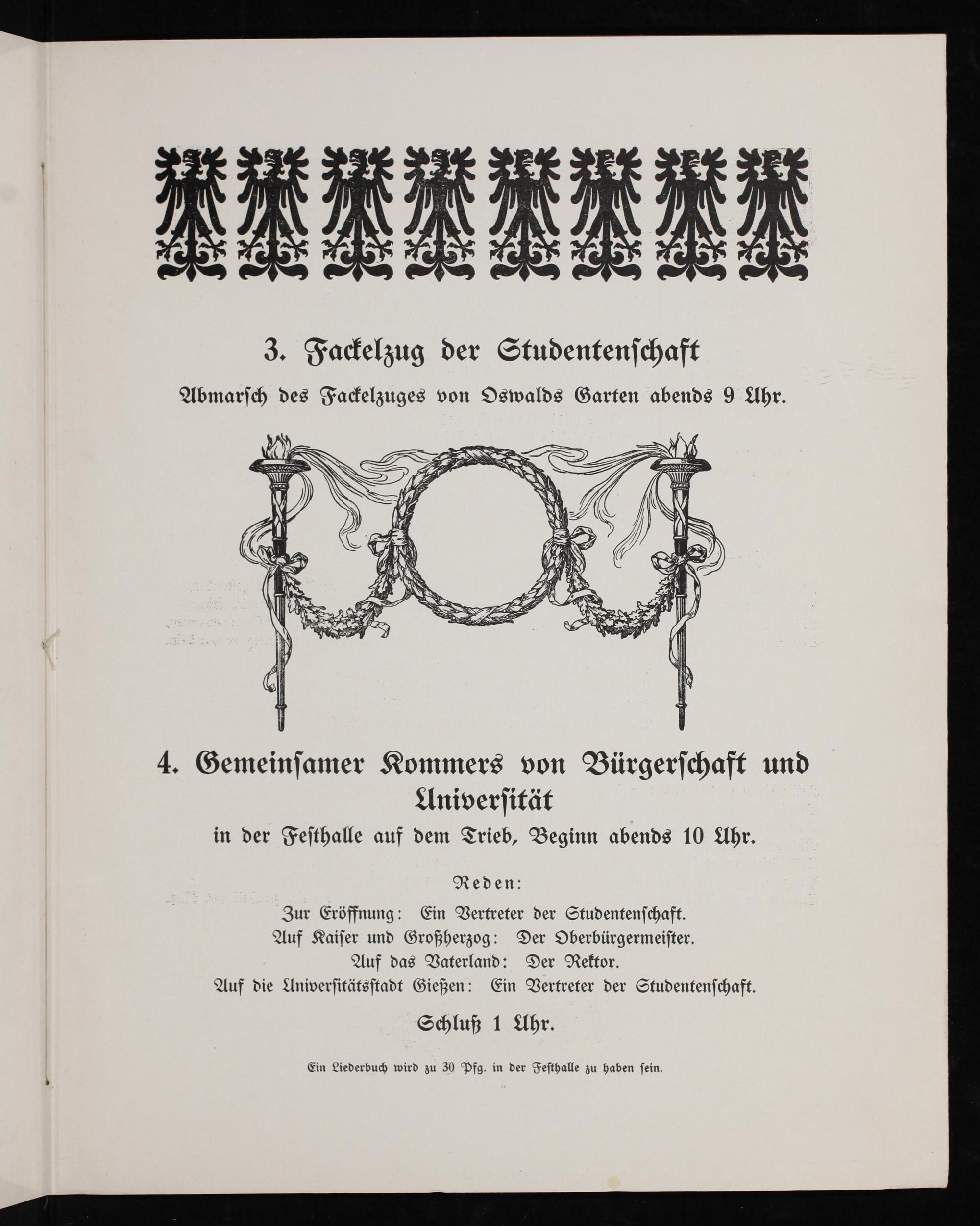 Zur Eröffnung: Ein Vertreter der Studentenſchaft. Auf Kaiſer und Großherzog: Der Oberbürgermeiſter. Auf das Vaterland: Der Rektor. Auf die Aniverſitätsſtadt Gießen: Ein Vertreter der Studentenſchaft.