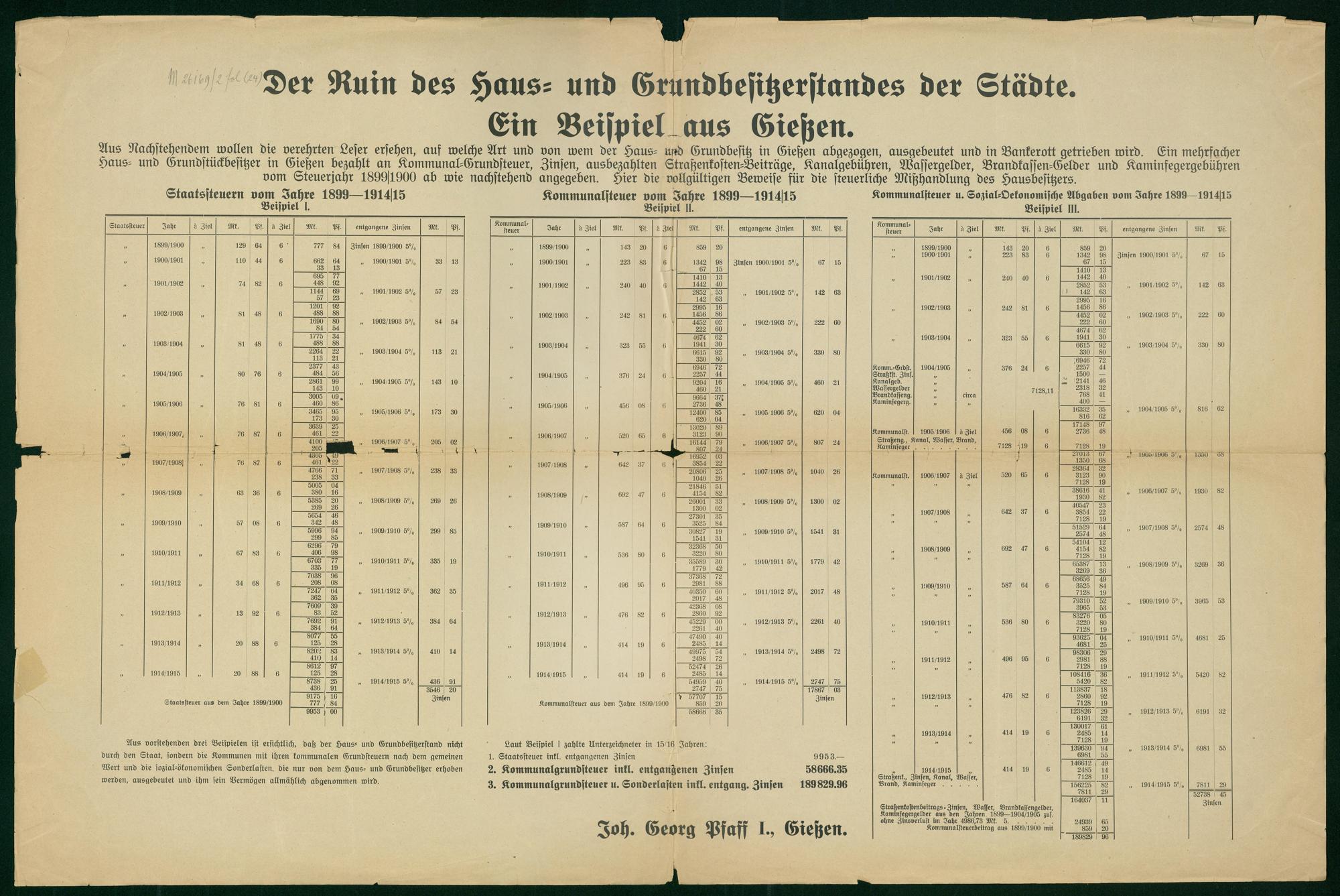 Aus Nachſtehendem wollen die verehrten Leſer erſehen, auf welche Art und von wem der Haus⸗ und Grundbeſitz in Gießen abgezogen, ausgebeutet und in Bankerott getrieben wird. Ein mehrfacher Haus- und Grundſtückbeſitzer in Gießen bezahlt an Kommunal⸗Grundſteuer, Zinſen, ausbezahlten Straßenkoſten⸗Beiträge, Kanalgebühren, WMaſſergelder, Brandkaſſen⸗Gelder und Kaminfegergebühren vom Steuerjahr 189981900 ab wie nachſtehend angegeben. Hier die vollgültigen Beweiſe für die ſteuerliche Mißhandlung des Hausbeſitzers.