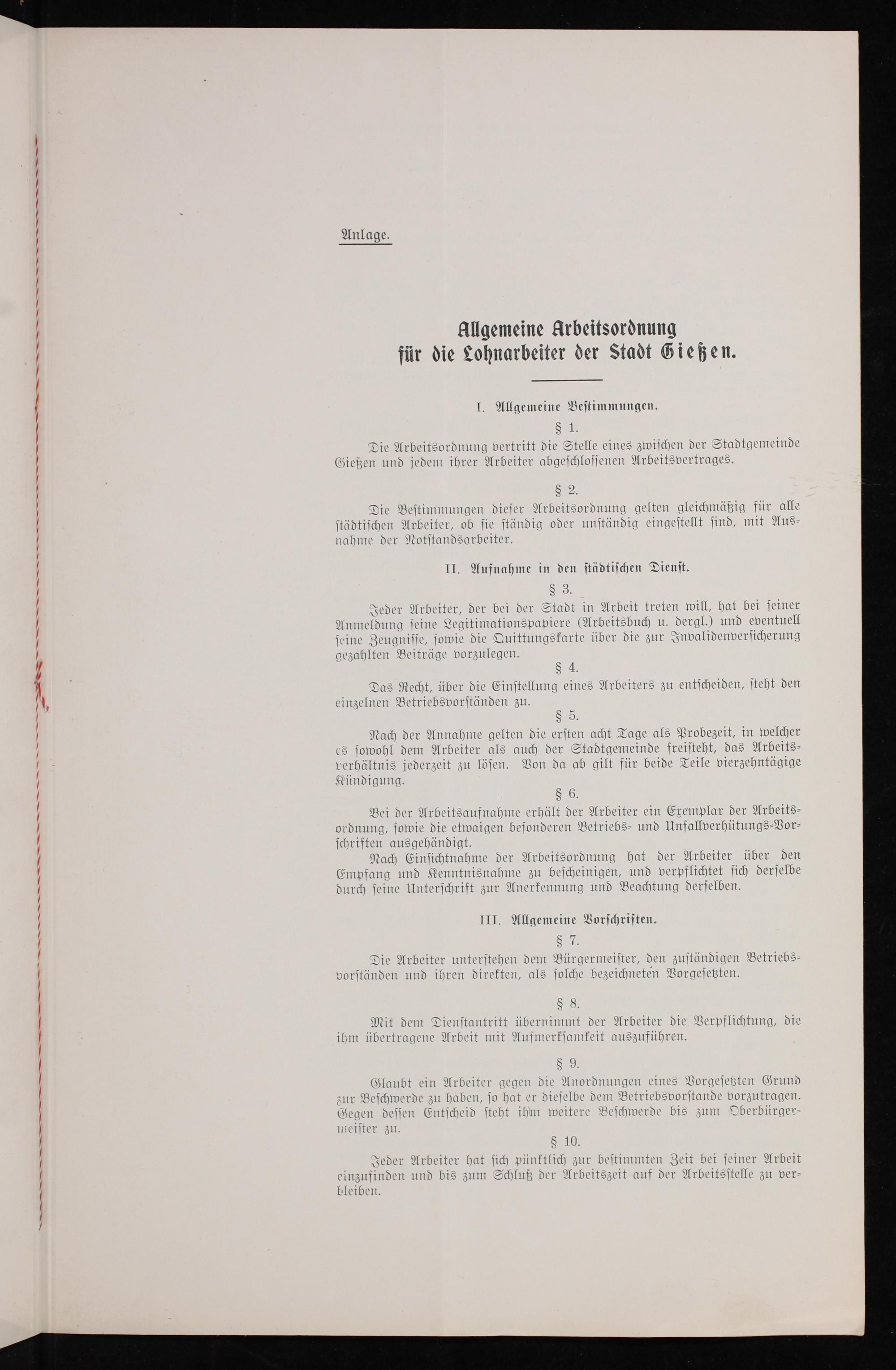 Allgemeine Arbeitsordnung für die Lohnarbeiter der Stadt Gießen.