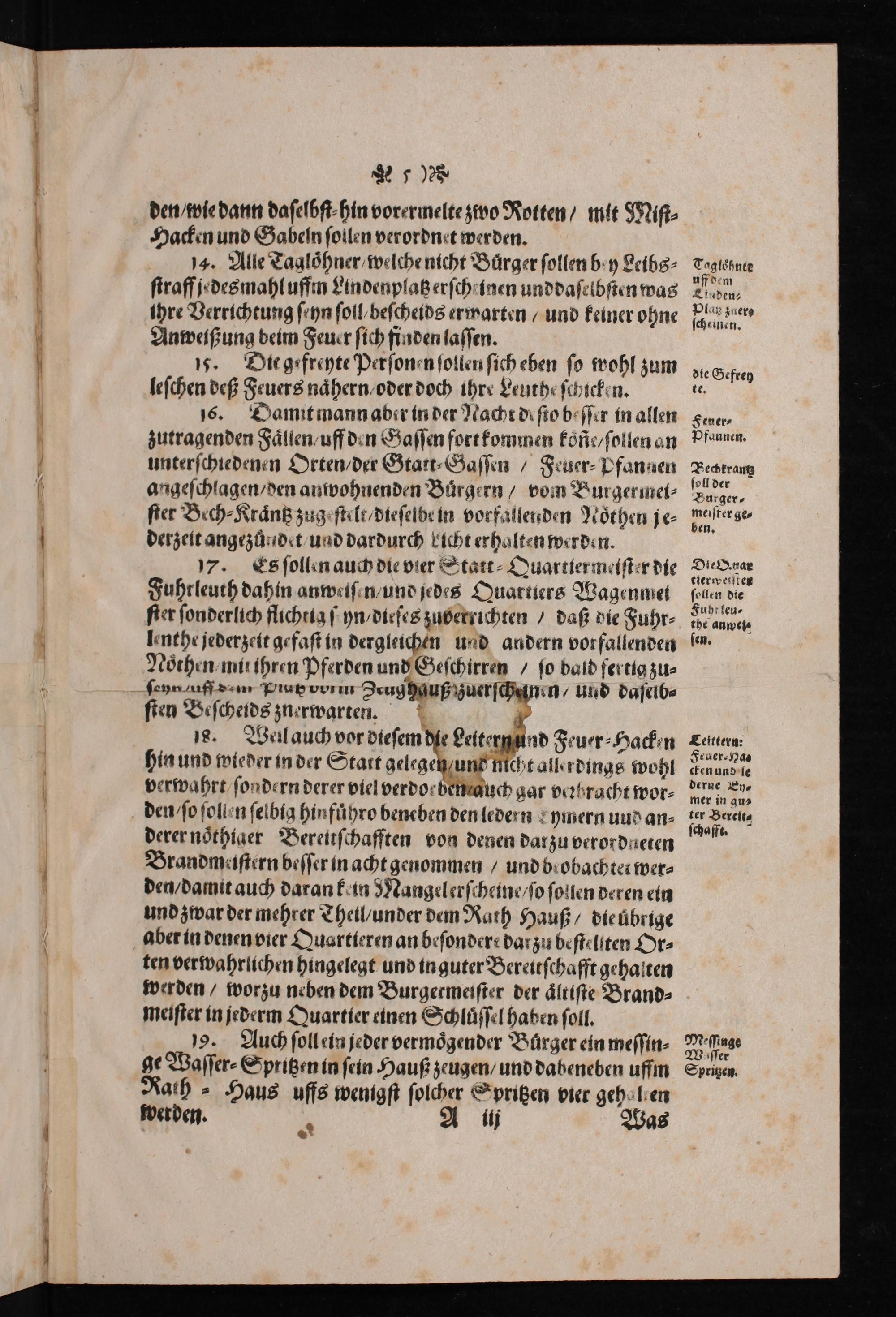 16. Damit mann aber in der Nacht deſto beſſer in allen zutragenden Faͤllen uff den Gaſſen fort kommen koñe/ ſollen an unterſchiedenen Orten/ der Gtatt⸗Gaſſen/ Feuer⸗Pfannen angeſchlagen/ den anwohnenden Buͤrgern/ vom Burgermei⸗ ſter Bech⸗Kraͤntz zugr ſtelt/ dieſelbe in vorfallenden Noͤthen je⸗ derzeit angezuͤndet und dardurch bicht erhalten werden.